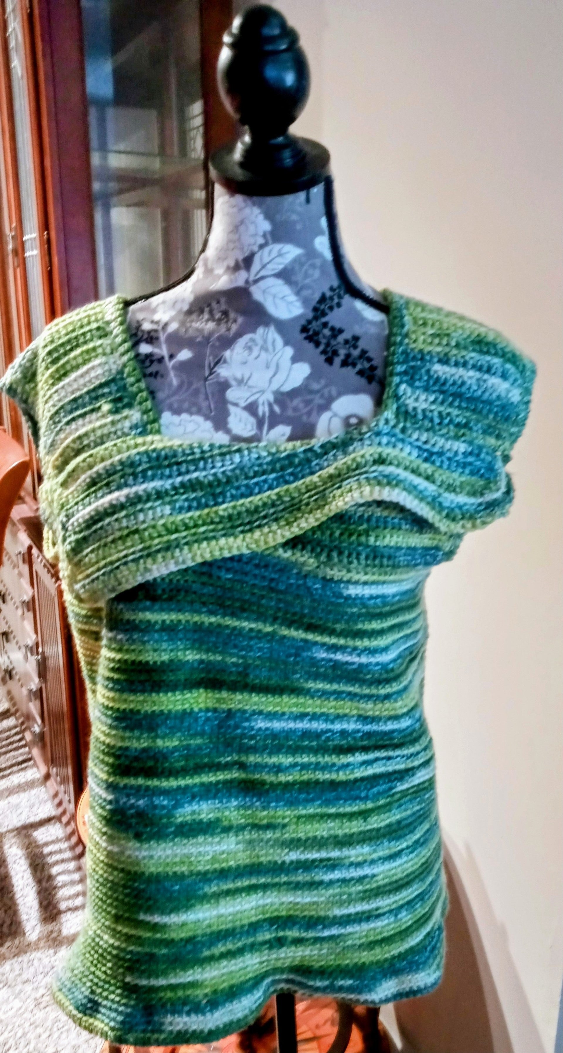Crocheted multicolored (green, Adult Dress Top with flap at the front neckline and frill hemline.