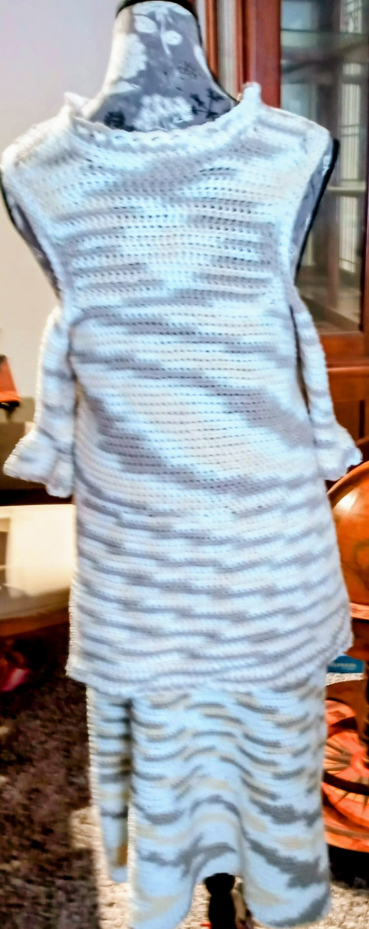 Crocheted pastel multicolored Skirt Suit with horizontal slit (left to right) in mid-length frilled sleeves and matching full length skirt'