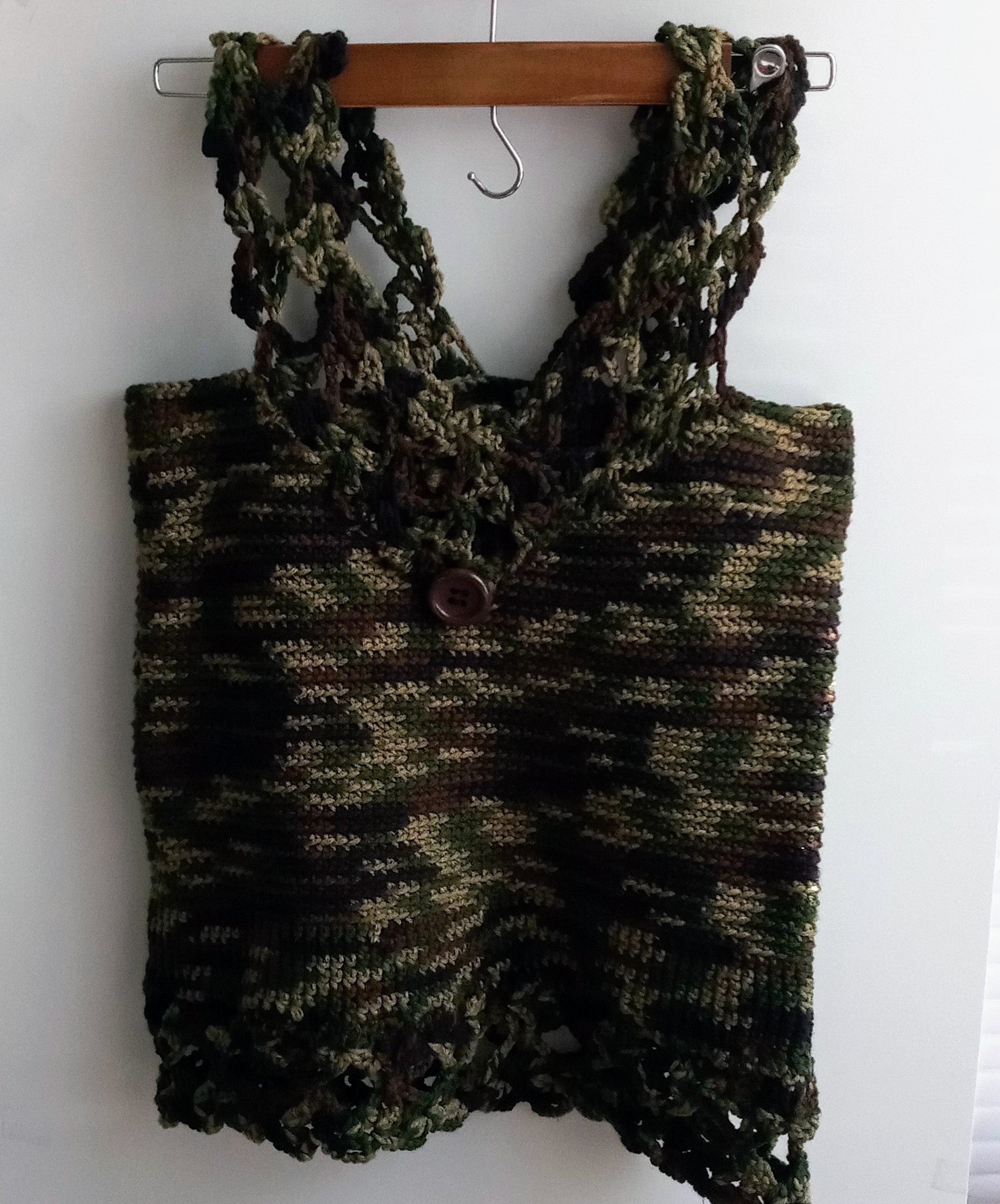 TOP: Patterned shoulder straps and hemline. Button at end of the "V" at the front of top.