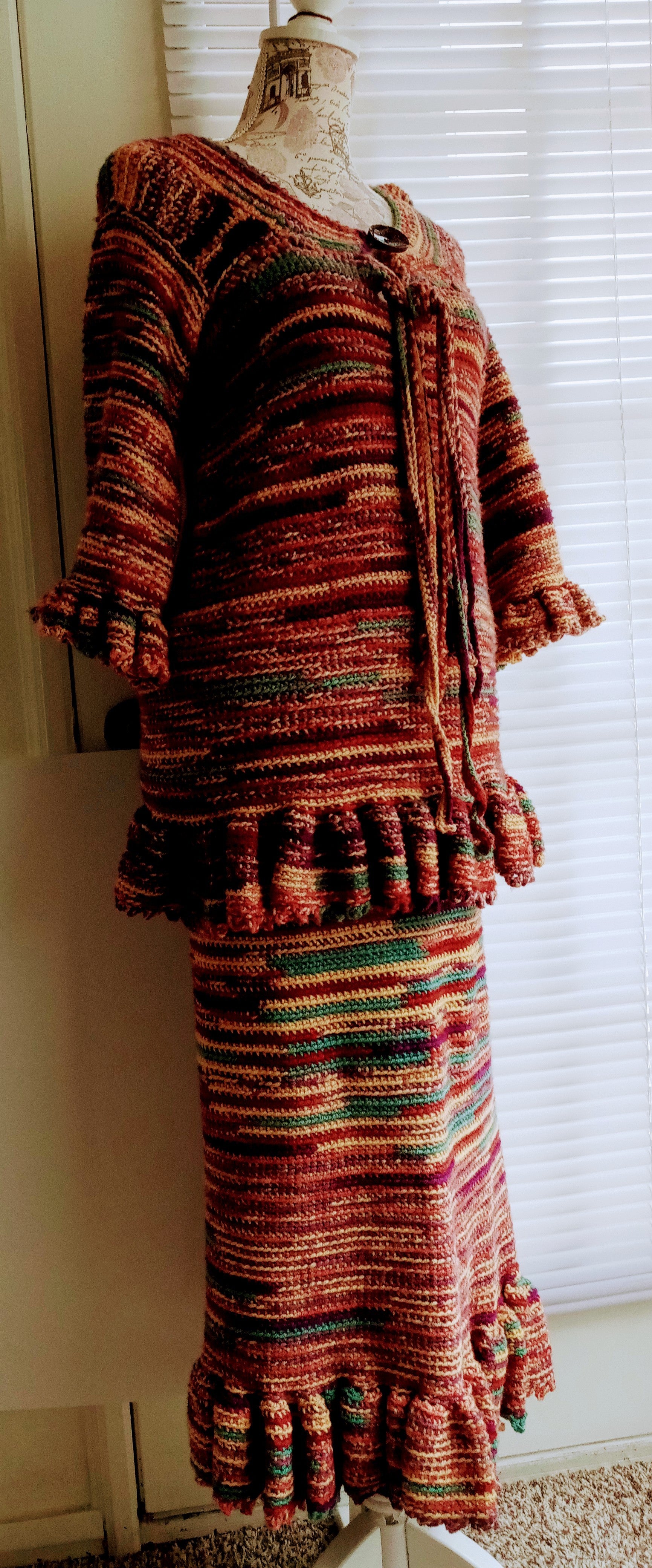 Crocheted multicolored (brown, green purple, tan) skirt suit with long frilled sleeves and adorned with large button at the neckline. Hemline 3.5-inch frills. Matching skirt with 4-inch frill