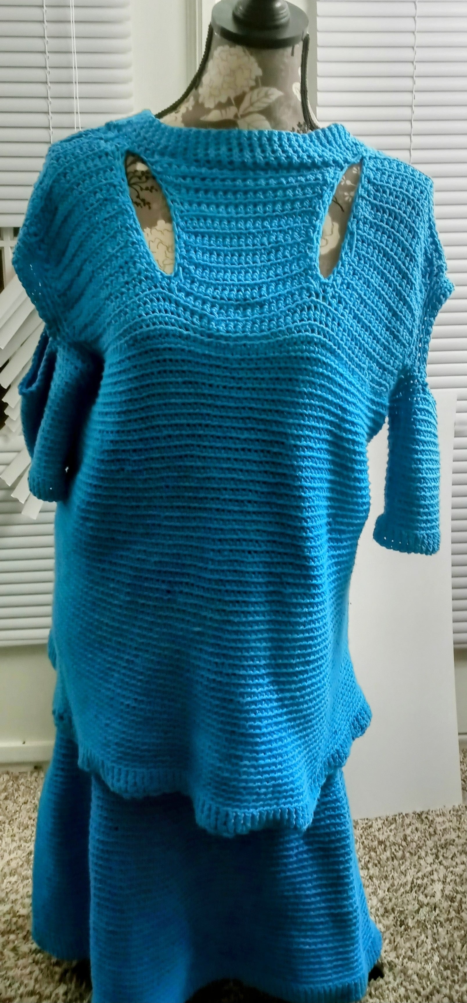 CROCHETED 100 PERCENT COTTON TURQUOISE SKIRT SUIT.