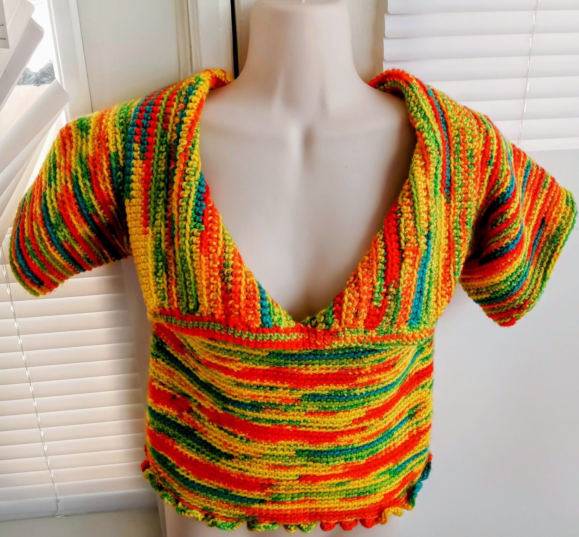 Crocheted multicolored Top with sleeves, collared and deep "v" Neckline.