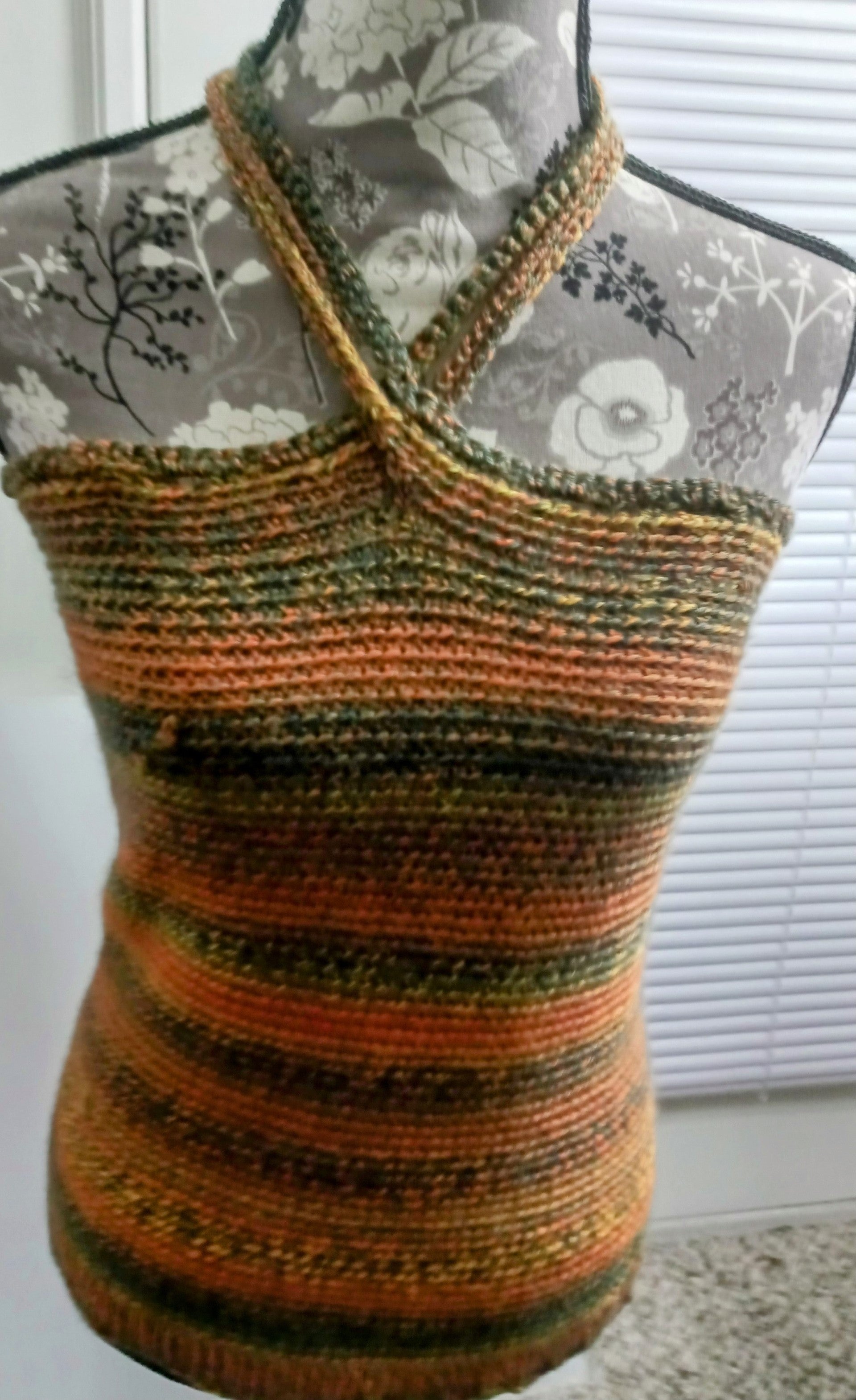 Crocheted multicolored (brown, gold, black) Tank Top with matching neckline and tie strings. Adorned with Chained hemline to add to its beauty.