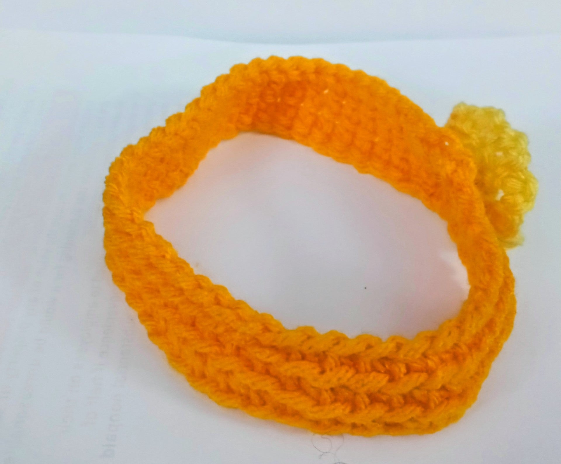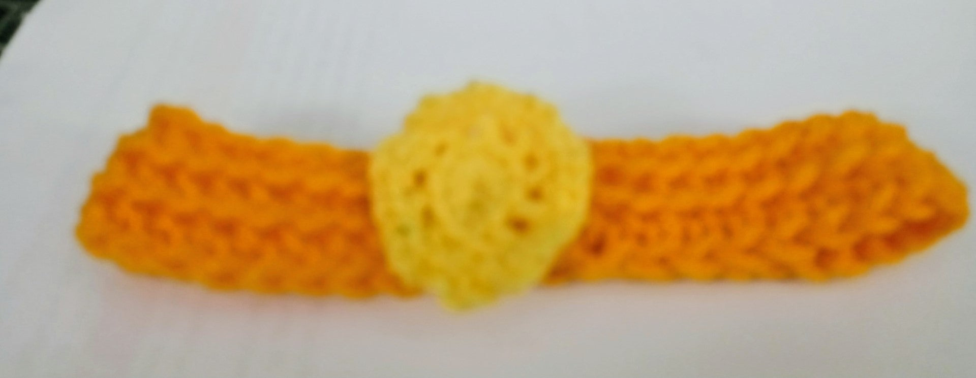 Crocheted light orange baby headband adorned with a yellow rosette for your