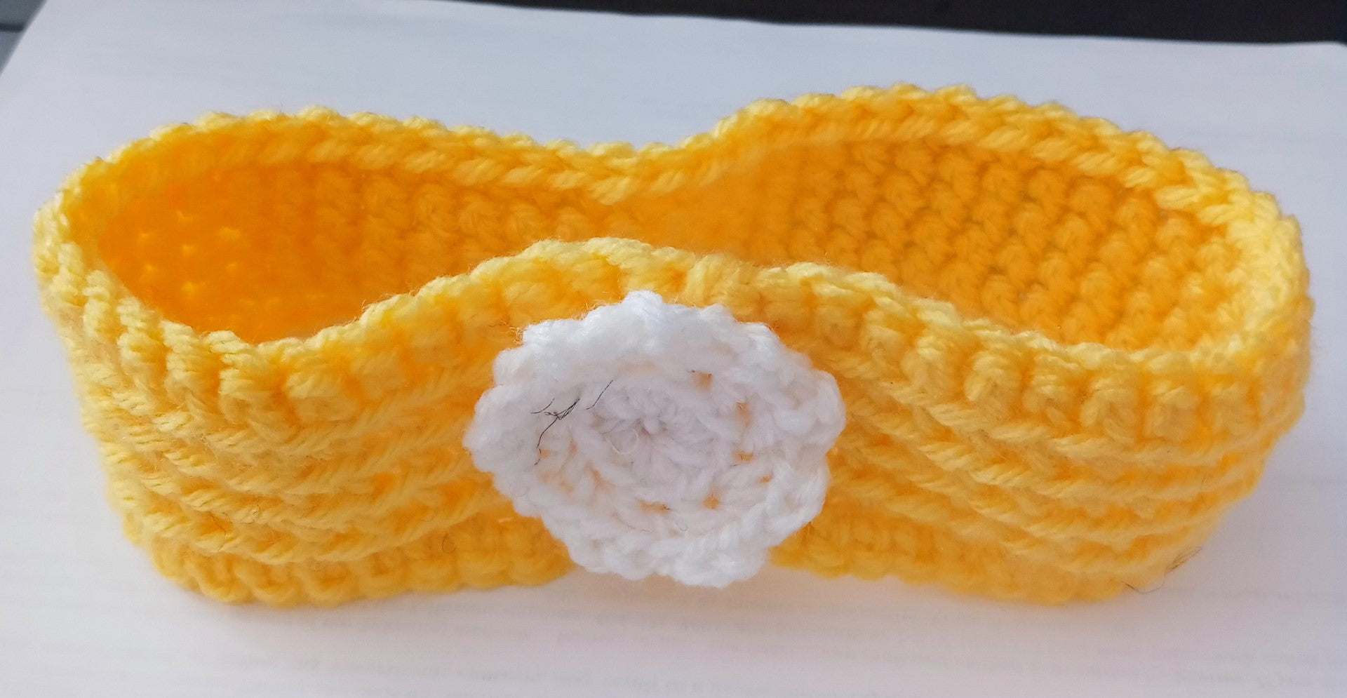 Crocheted yellow baby headband adorned with a white rosette for your "BUNDLE OF JOY" or as that SPECIAL BABY SHOWER GIFT