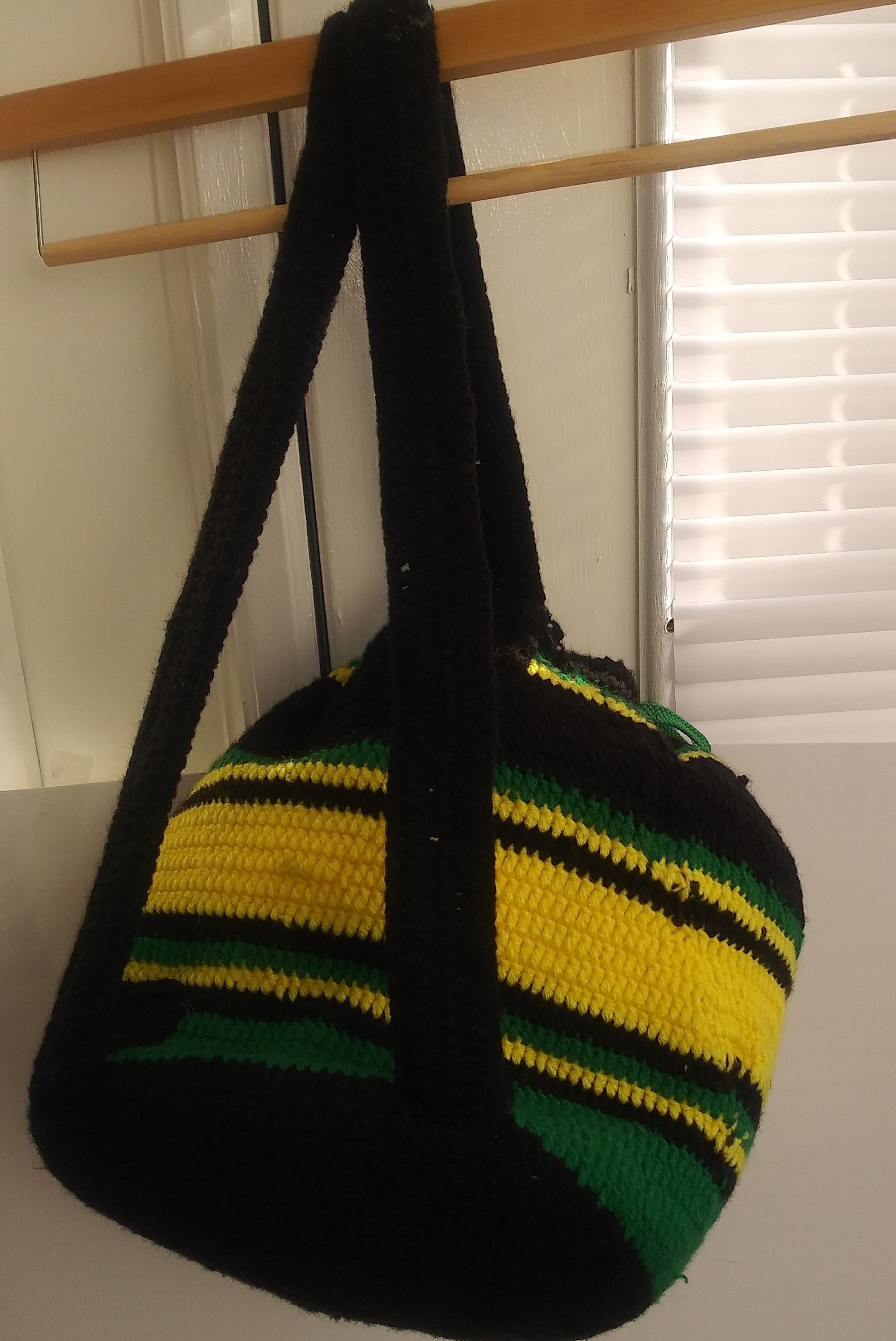 Crocheted multicolored (BLACK, GREEN and YELLOW) Bag/ Knapsack for work and play. Fully lined with leather on the inside for sturdiness and to add to its beauty. Tie string to close.