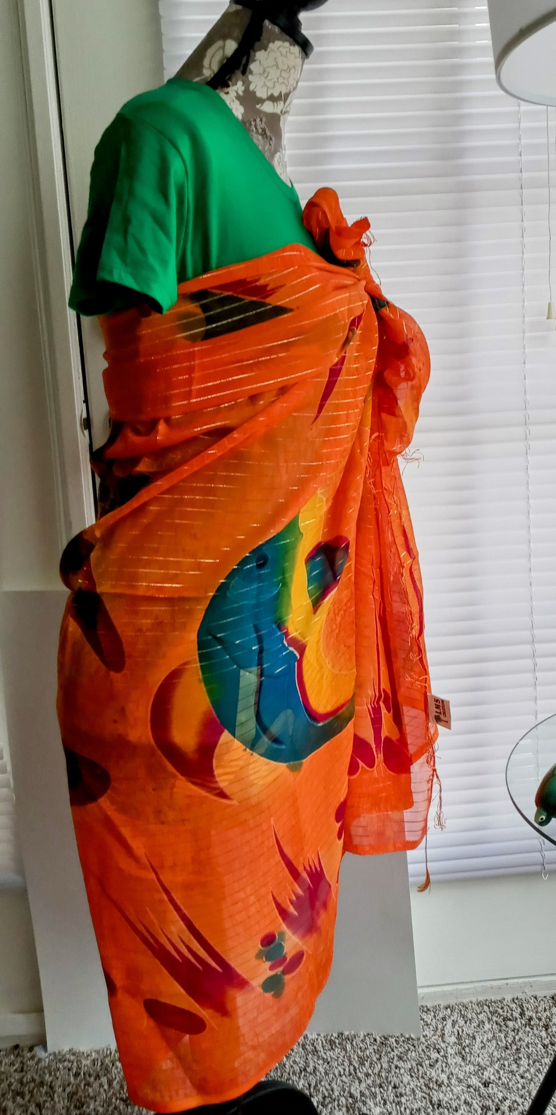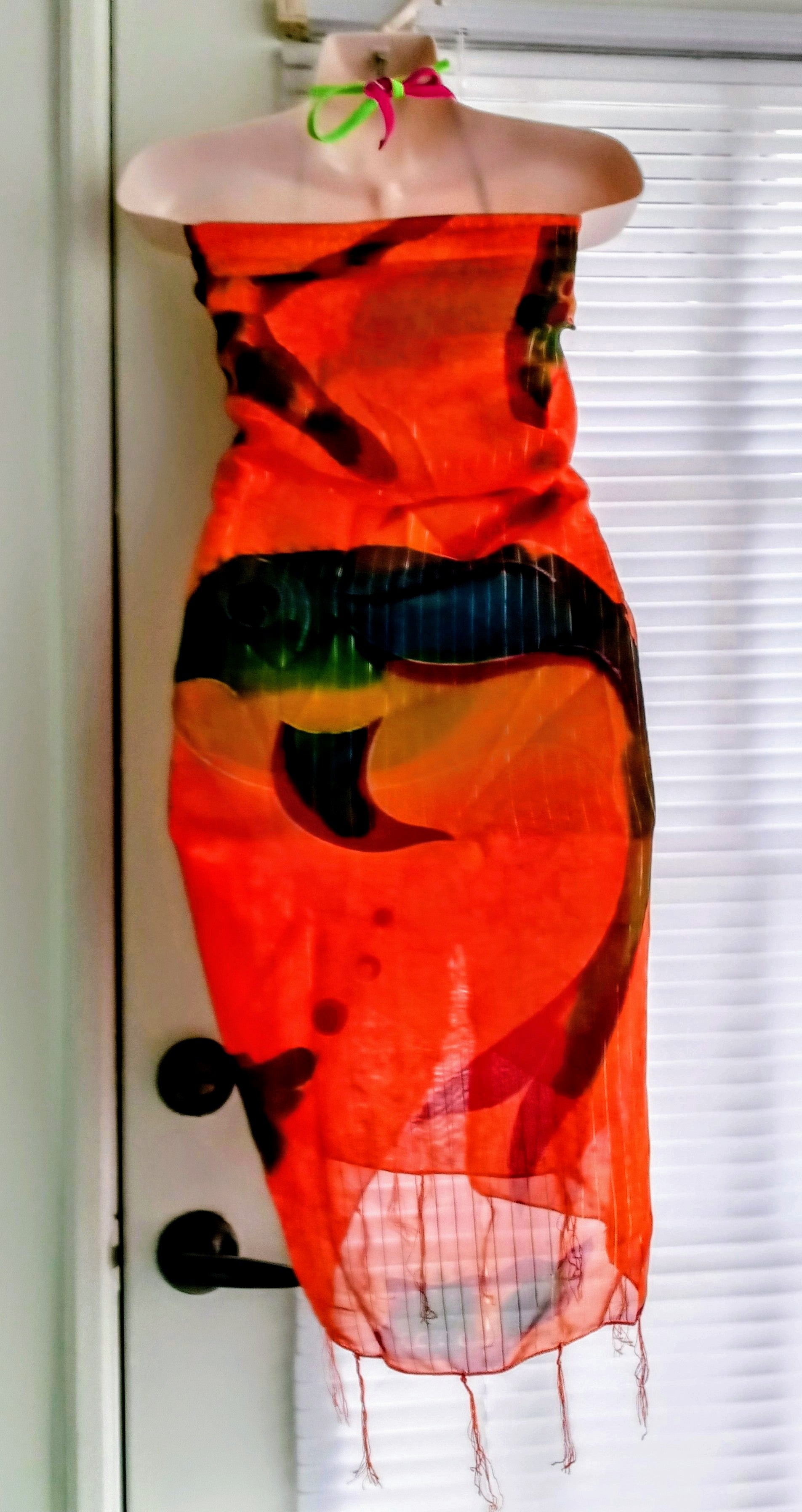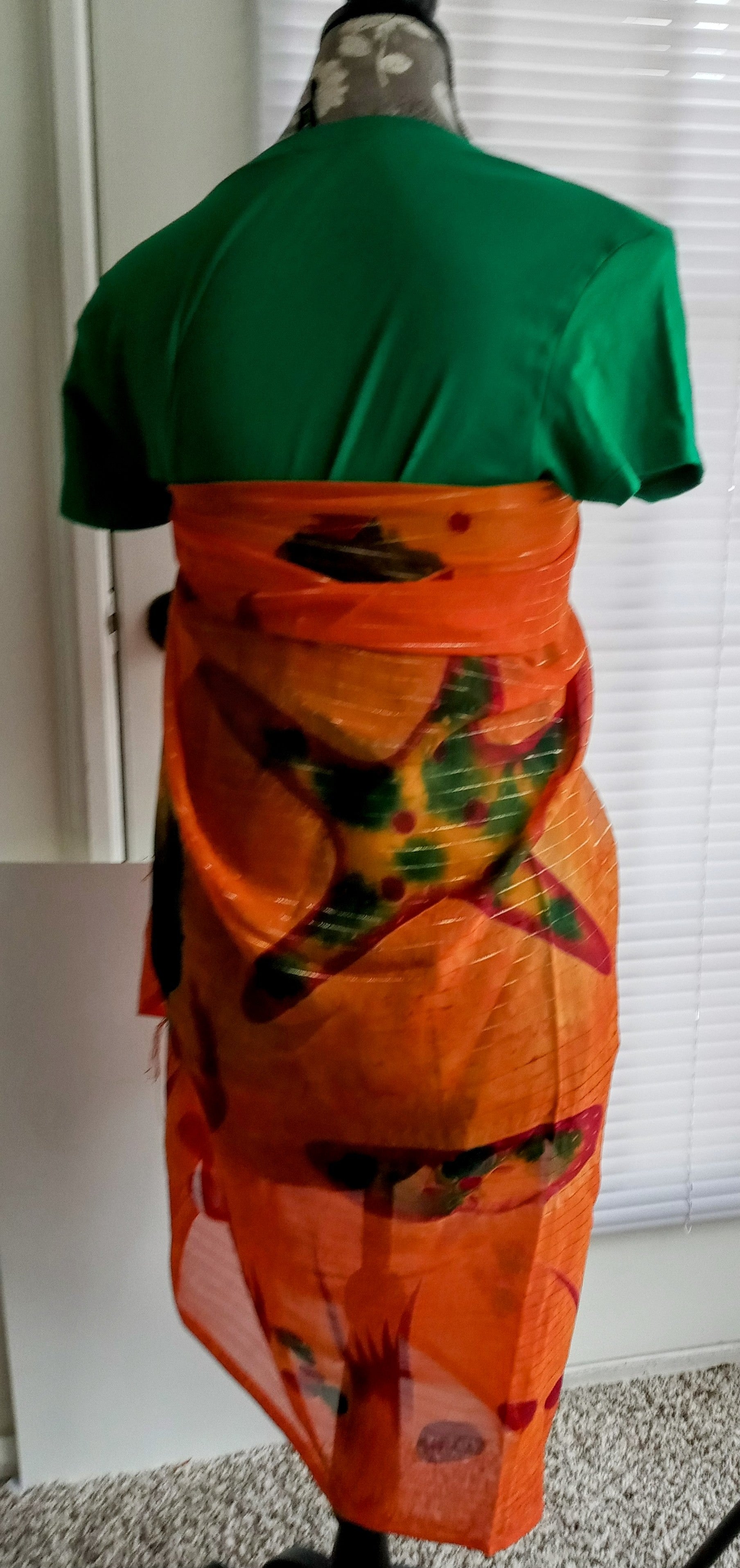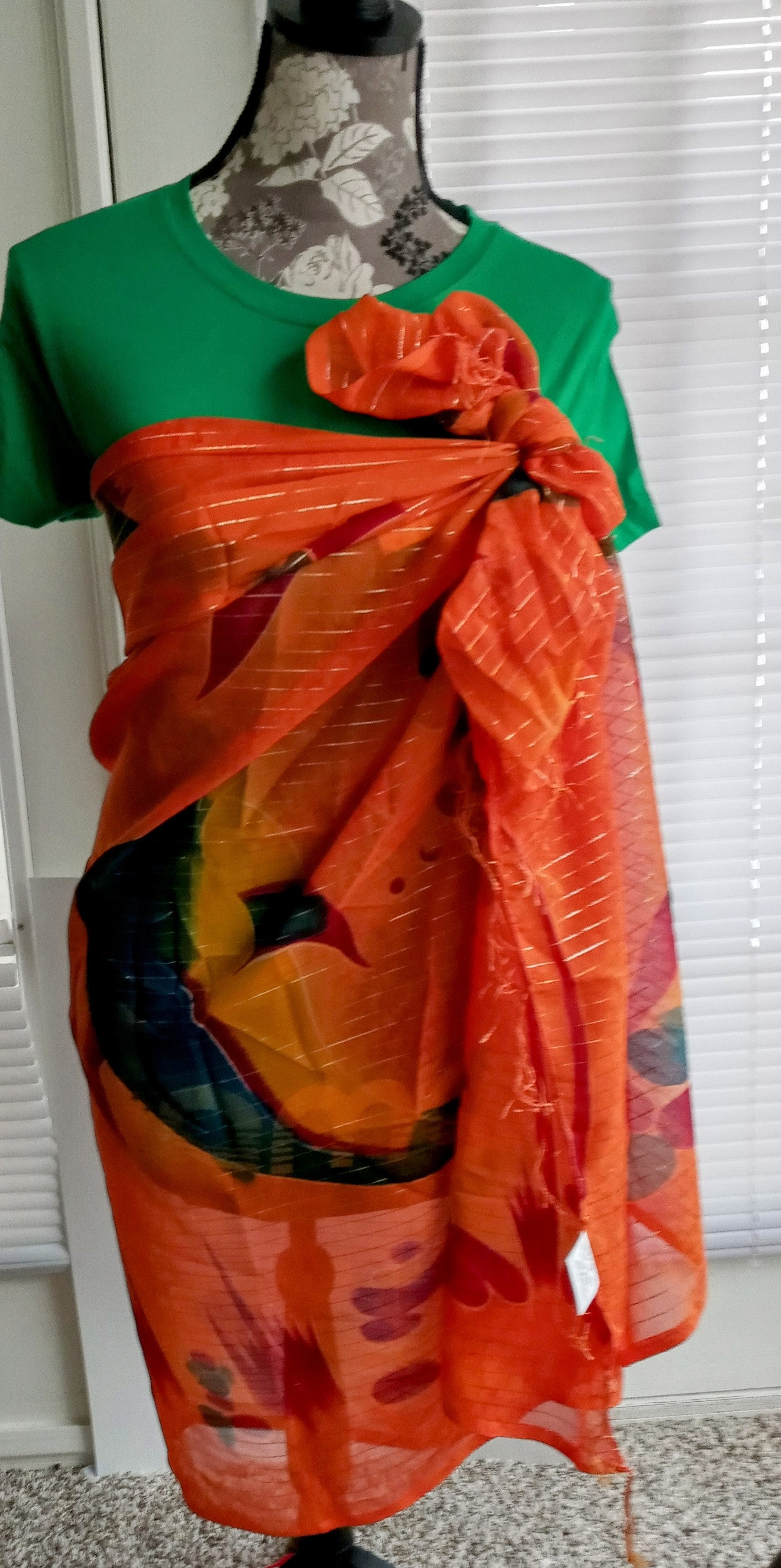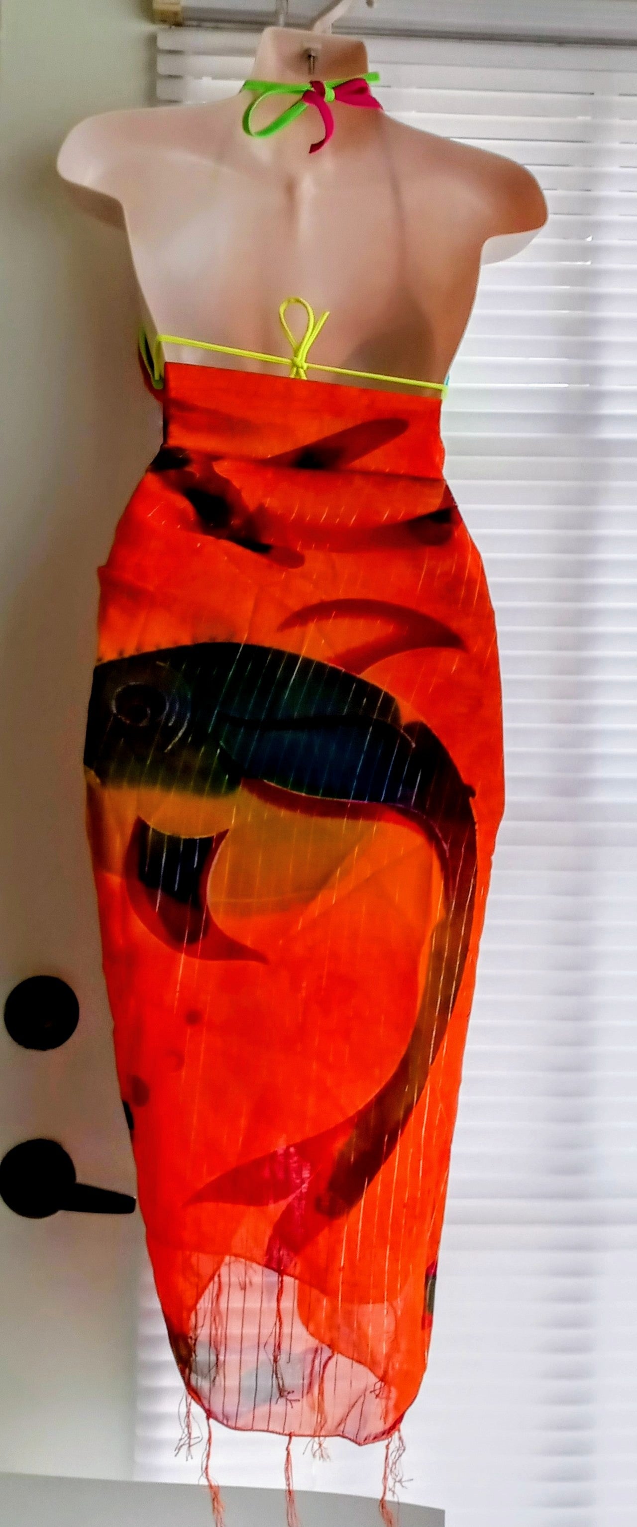 Beautiful multicolored (orange, maroon red, green adorned with gold streaks) sheer Beach Cover Up. Adorned with 2.5 inches spaced light tassels at the neckline and hemline that adds to its immense beauty. Bikini swim suit sold separately.