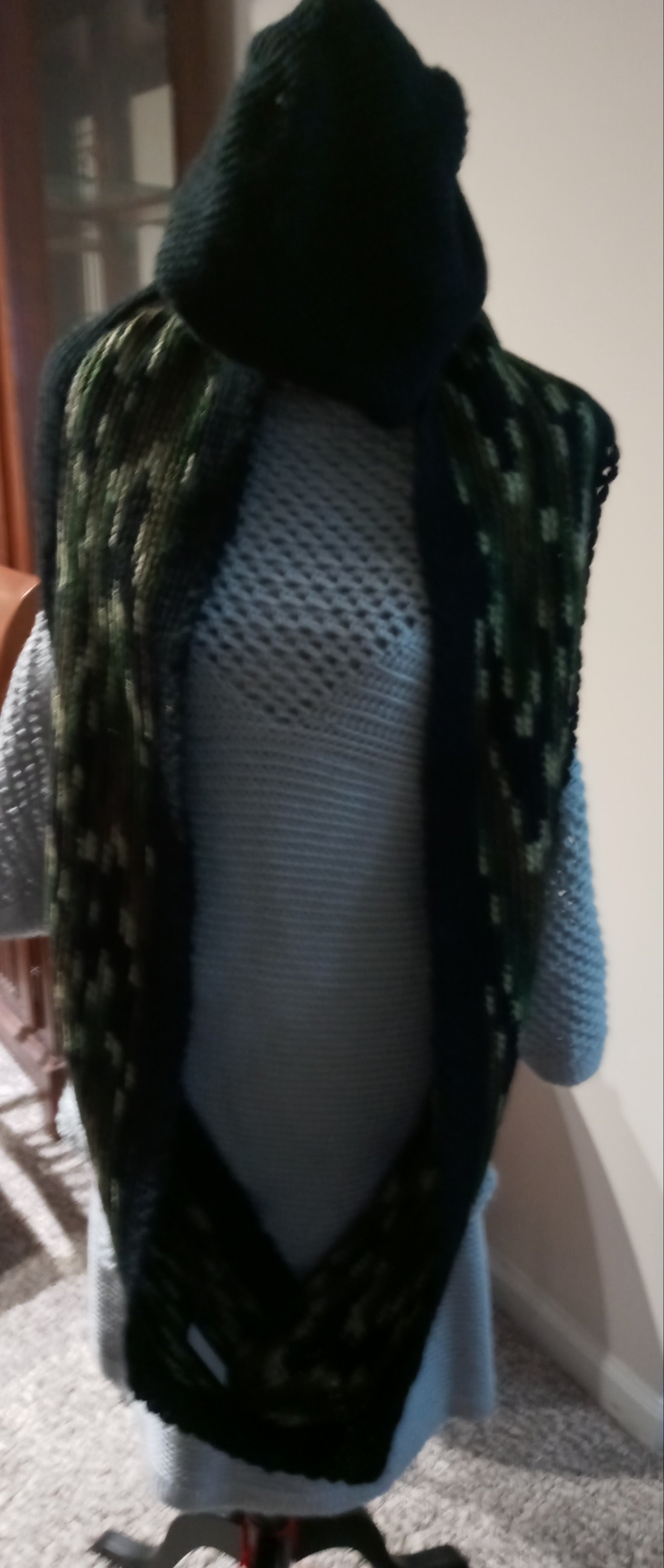Beautiful crocheted black Beenie and army green closed Long Scarf adorned with black yarn to add to its beauty .