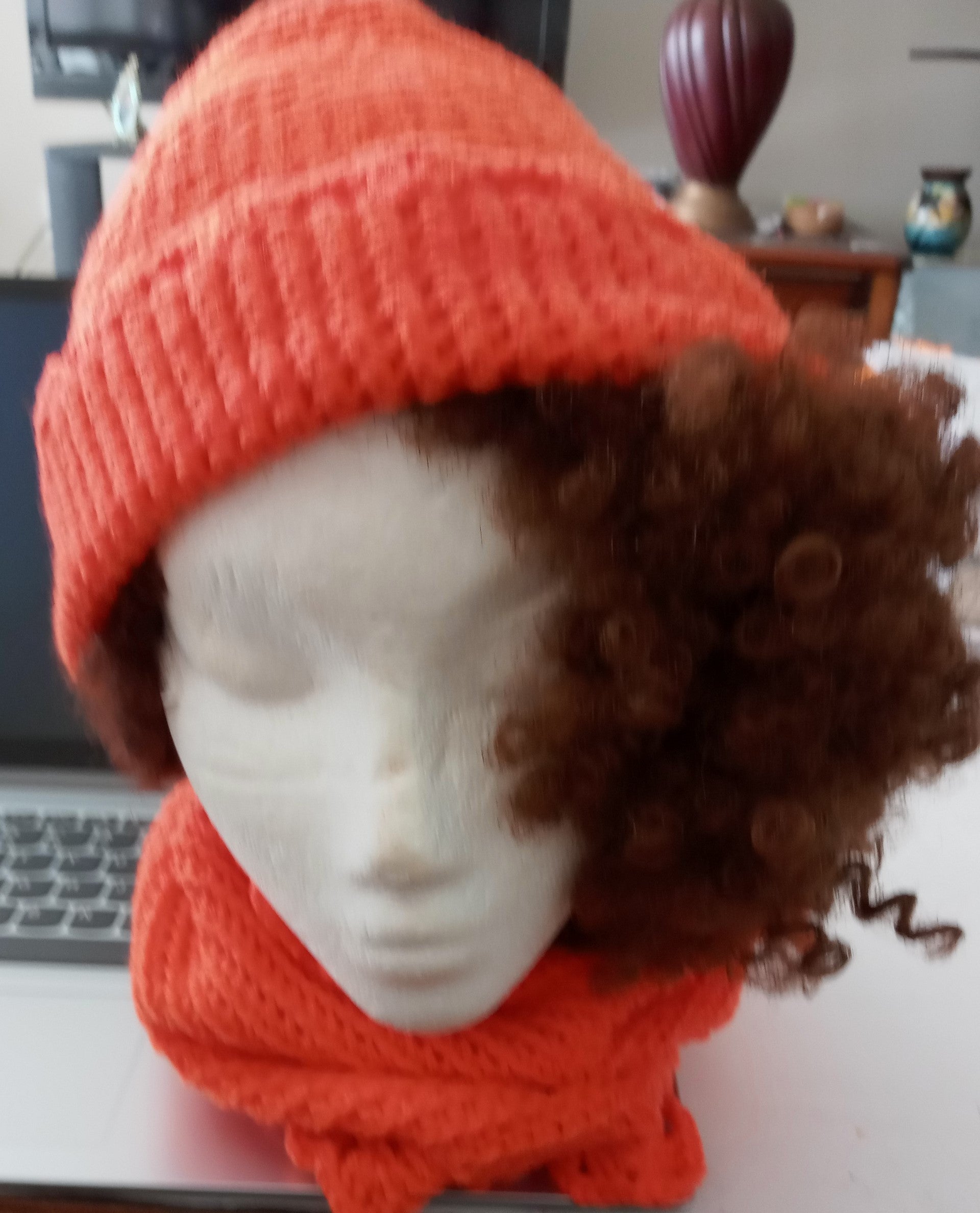Beautiful crocheted bright orange Beenie with patterned border and optional cuff. Matching Neck Scarf with patterned borders.