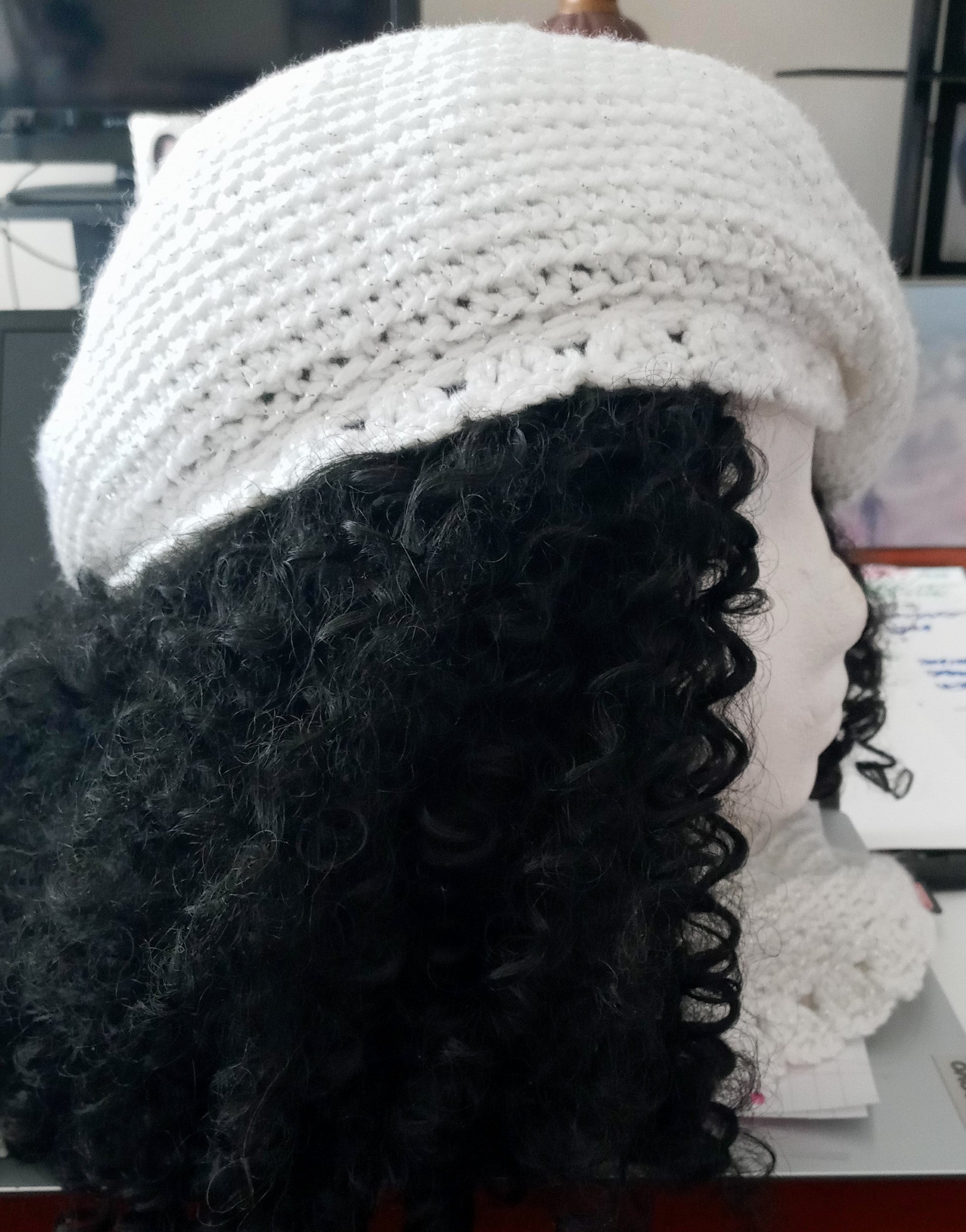 Crocheted white with silver streaks Beret and Neck Scarf set. Beret with patterned brim and matching neck scarf with matching patterned borders.