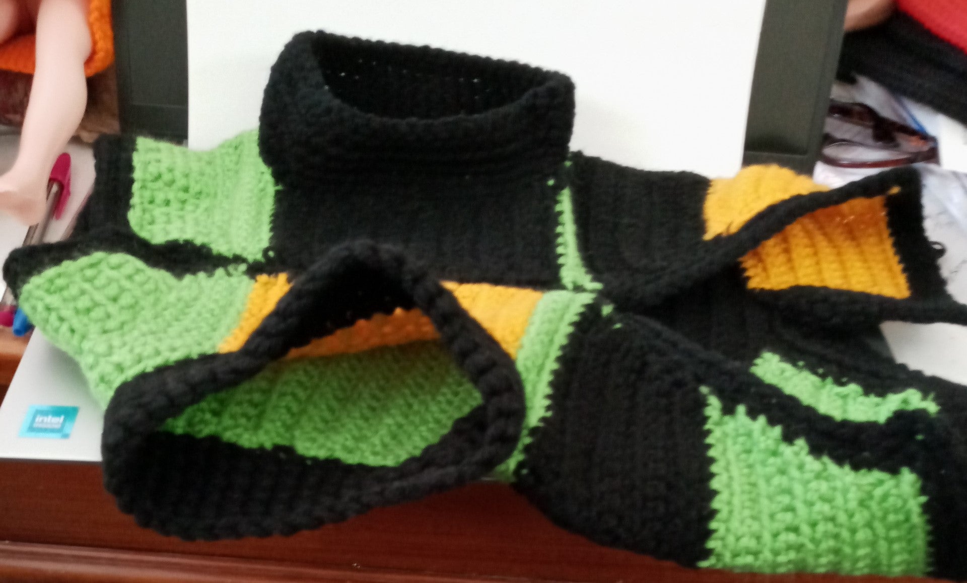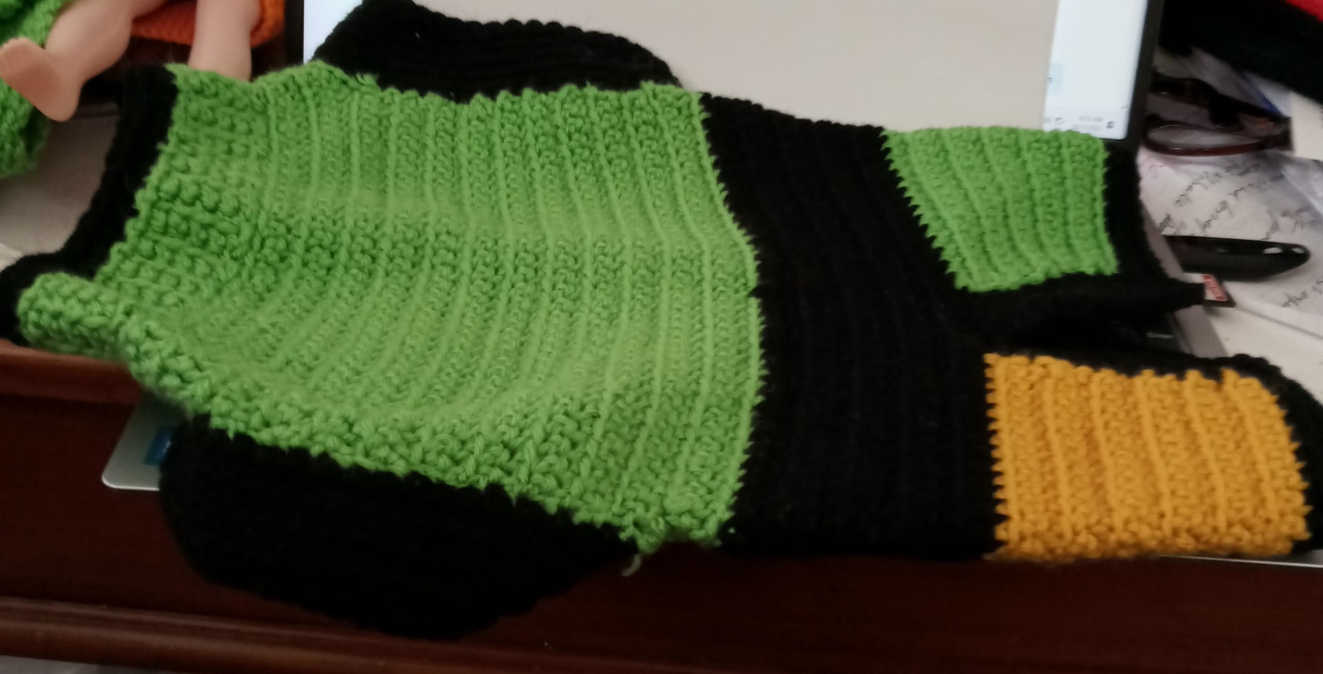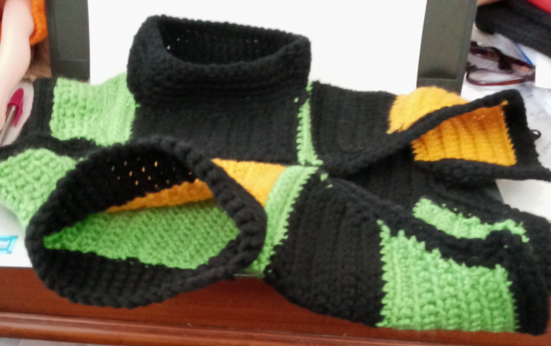 Black, green and gold crocheted Large Dog Jacket Opening in the front and back at the hemline tp give additional space and flexibility if needed.
