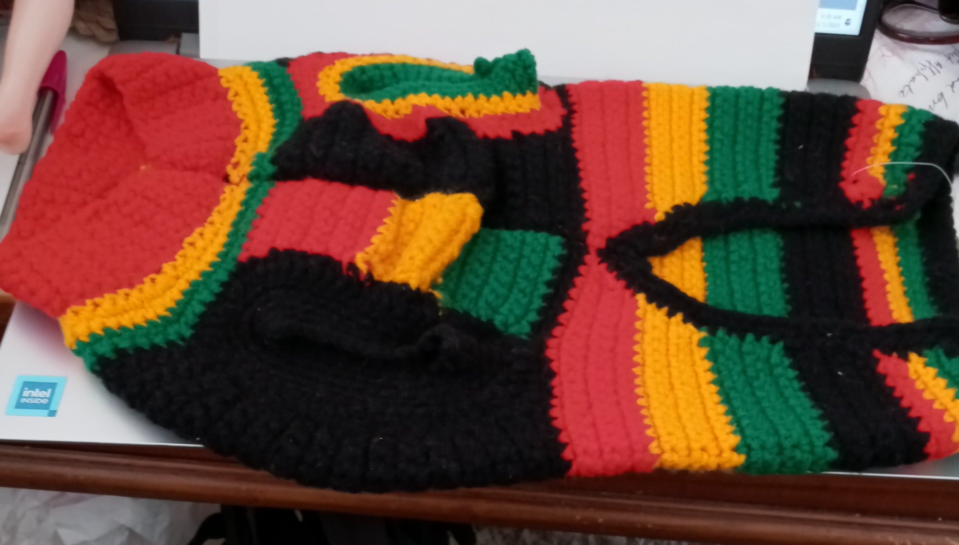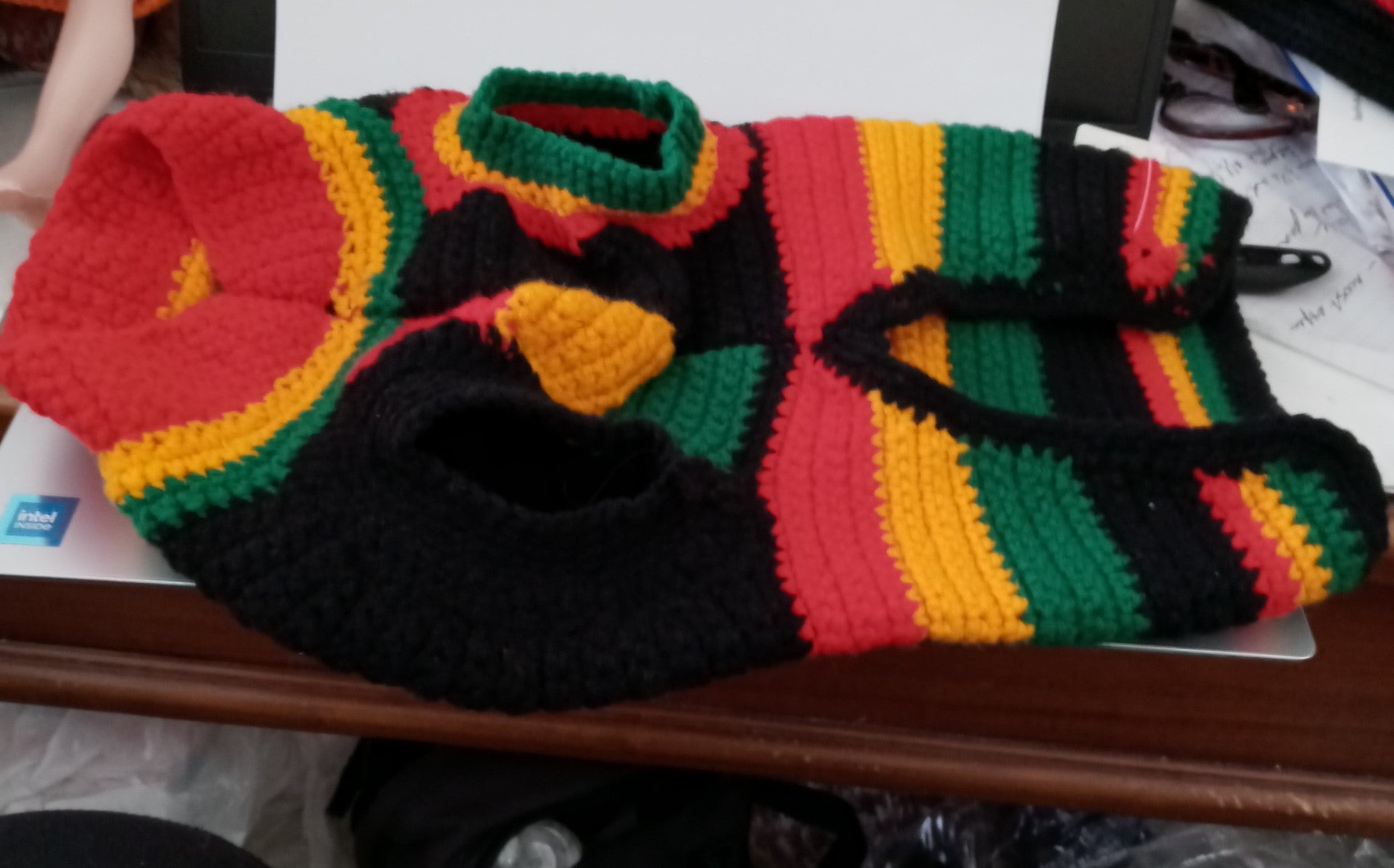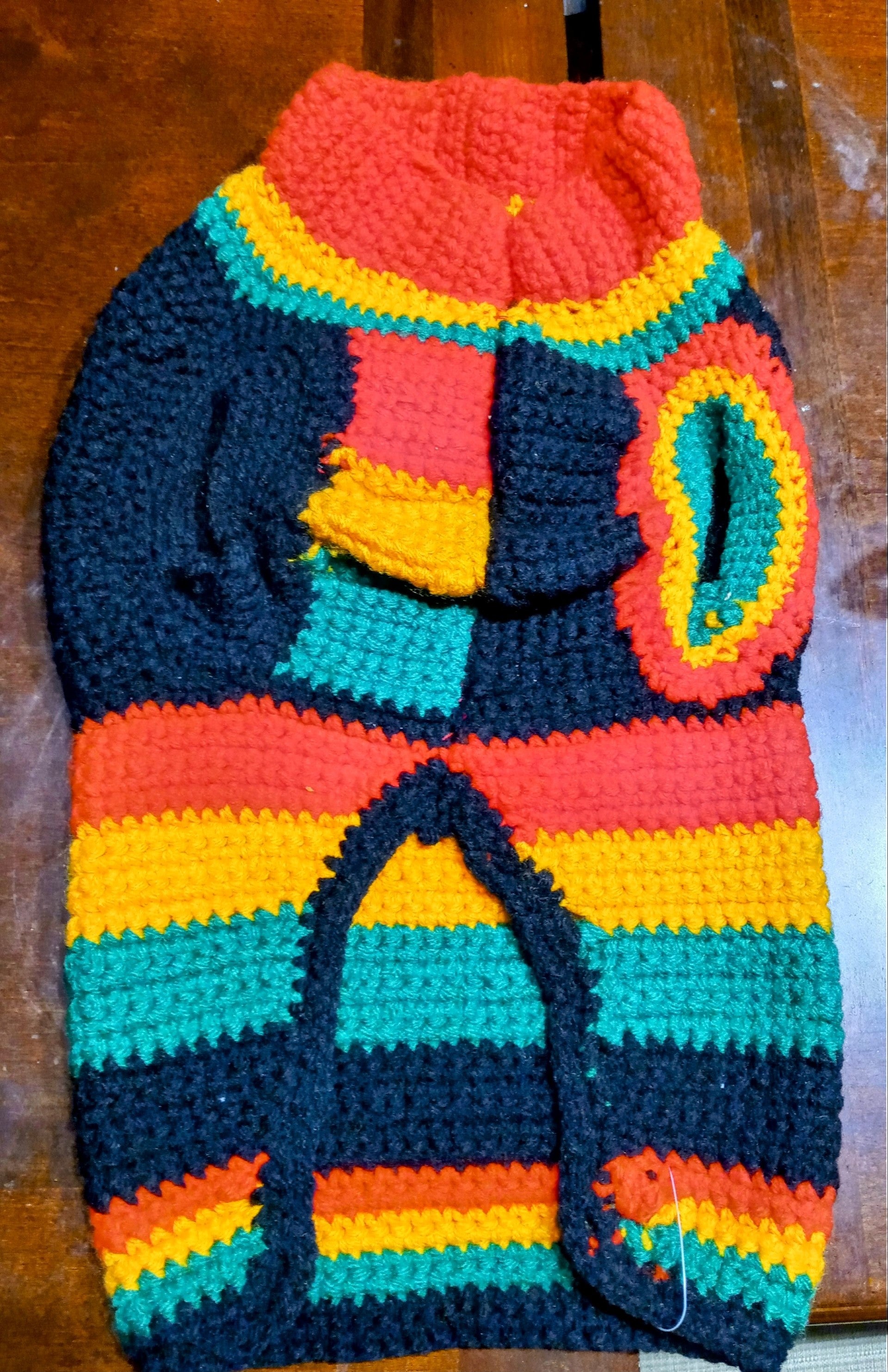 Crocheted Multicolored ( red, black, green, orange) Dog Jacket Extra chest space to provide comfort.
