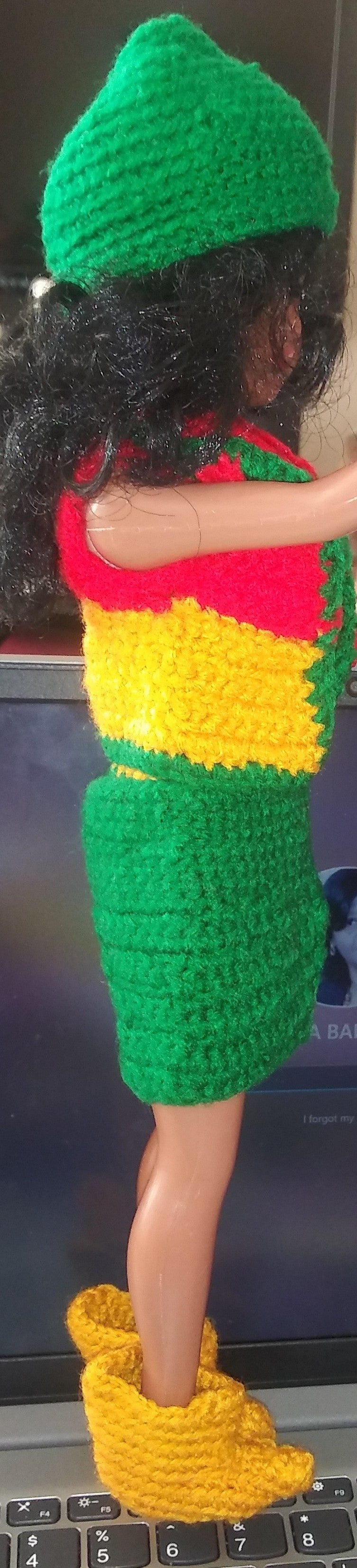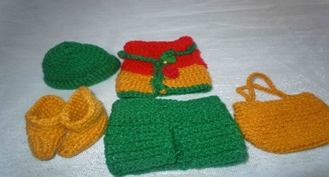 Crocheted green, gold and red doll outfit. Green skirt with green, gold and red top, with gold booties, green Beenie and gold handbag.