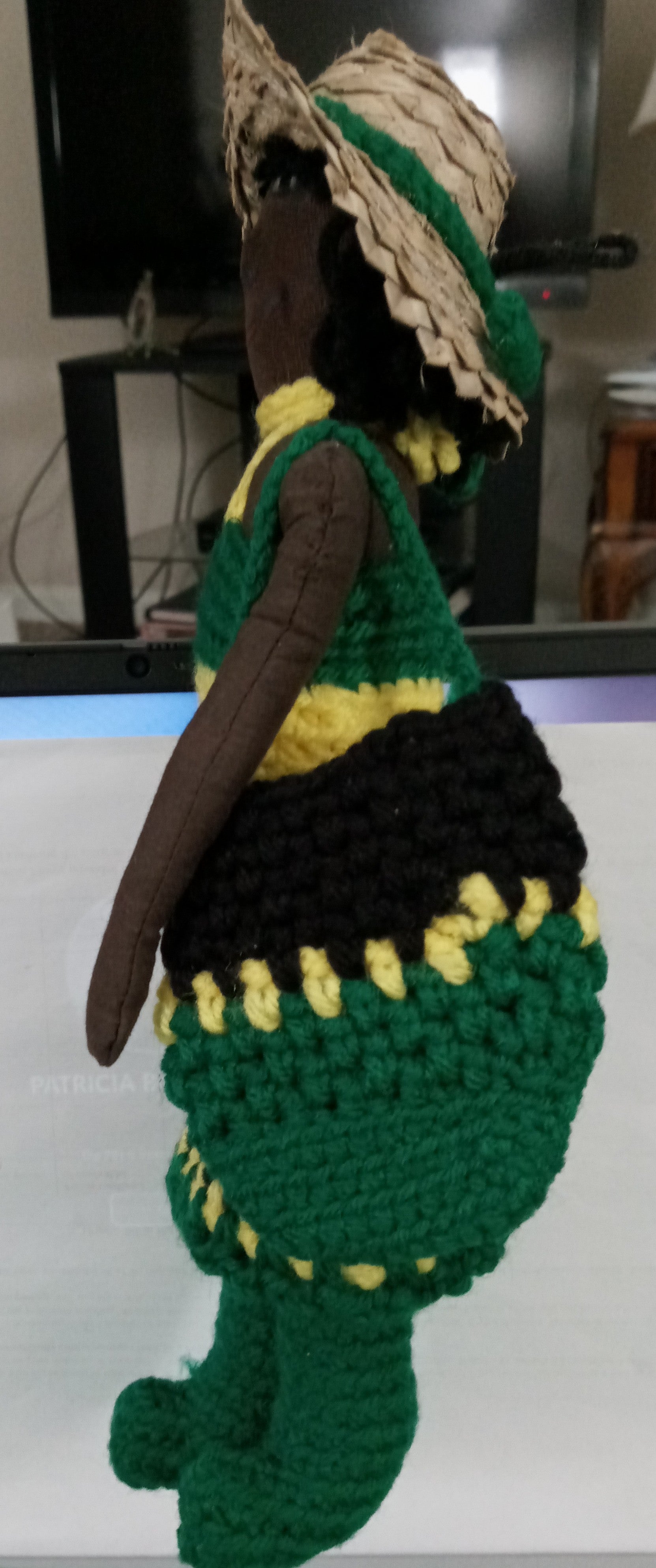 Stuffed fabric girl doll. dressed in crocheted multicolored ( black green and yellow) skirt and top embroidered with "JAMAICA" . , Green long boots, with matching black, yellow and green bag with straw hat with green sash. String on Beenie used to hang doll when not in use.