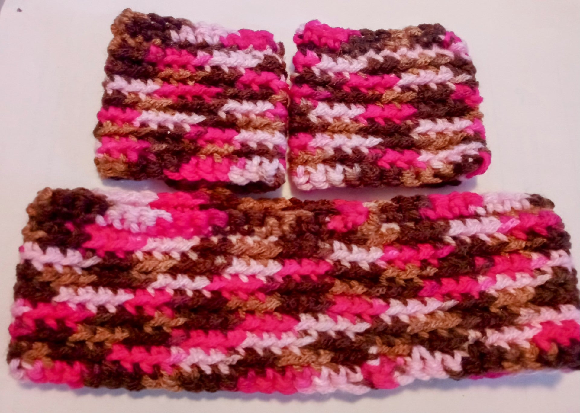 Crocheted multicolored ) Headband and two (2) Wristbands for the exercise enthusiast and useful for an array of physical activities.