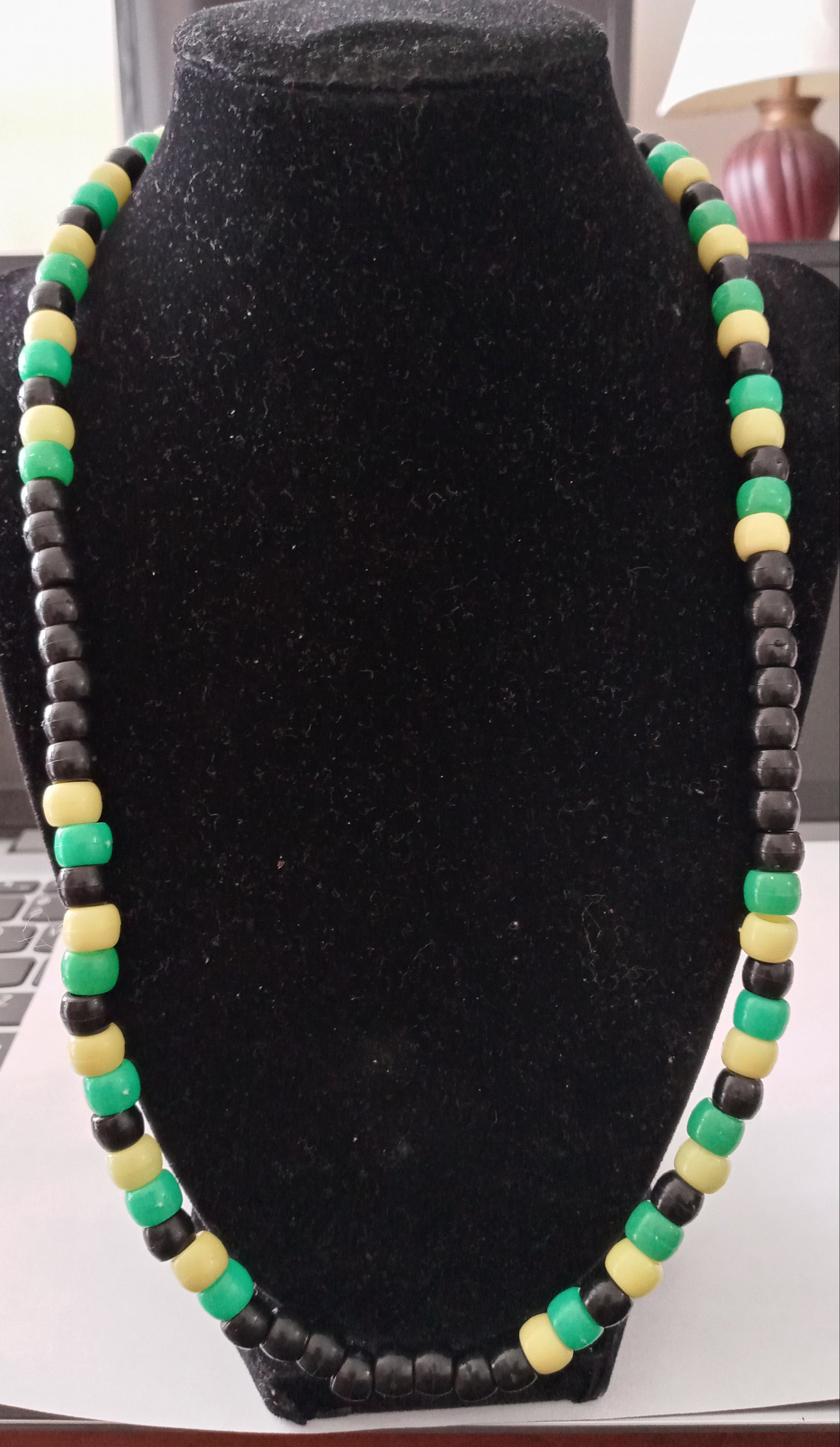 Large green and yellow beaded Necklace, adorned with black Acrylic beads. Gold colored tiny corrugated Rounds with screw-in latch to fasten.