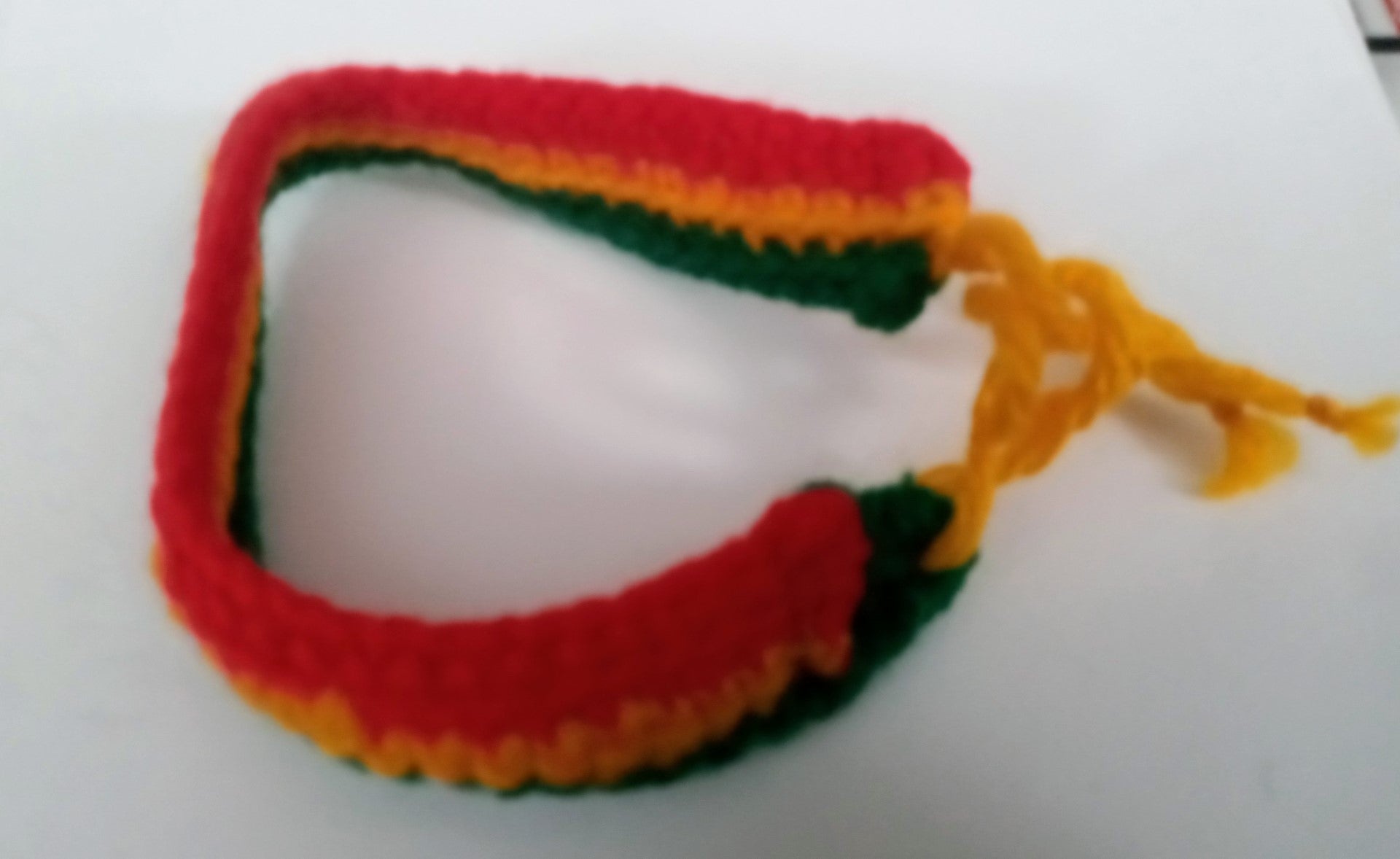 One (1) red, gold, green crocheted Bracelet adorned with gold tie string to fasten..