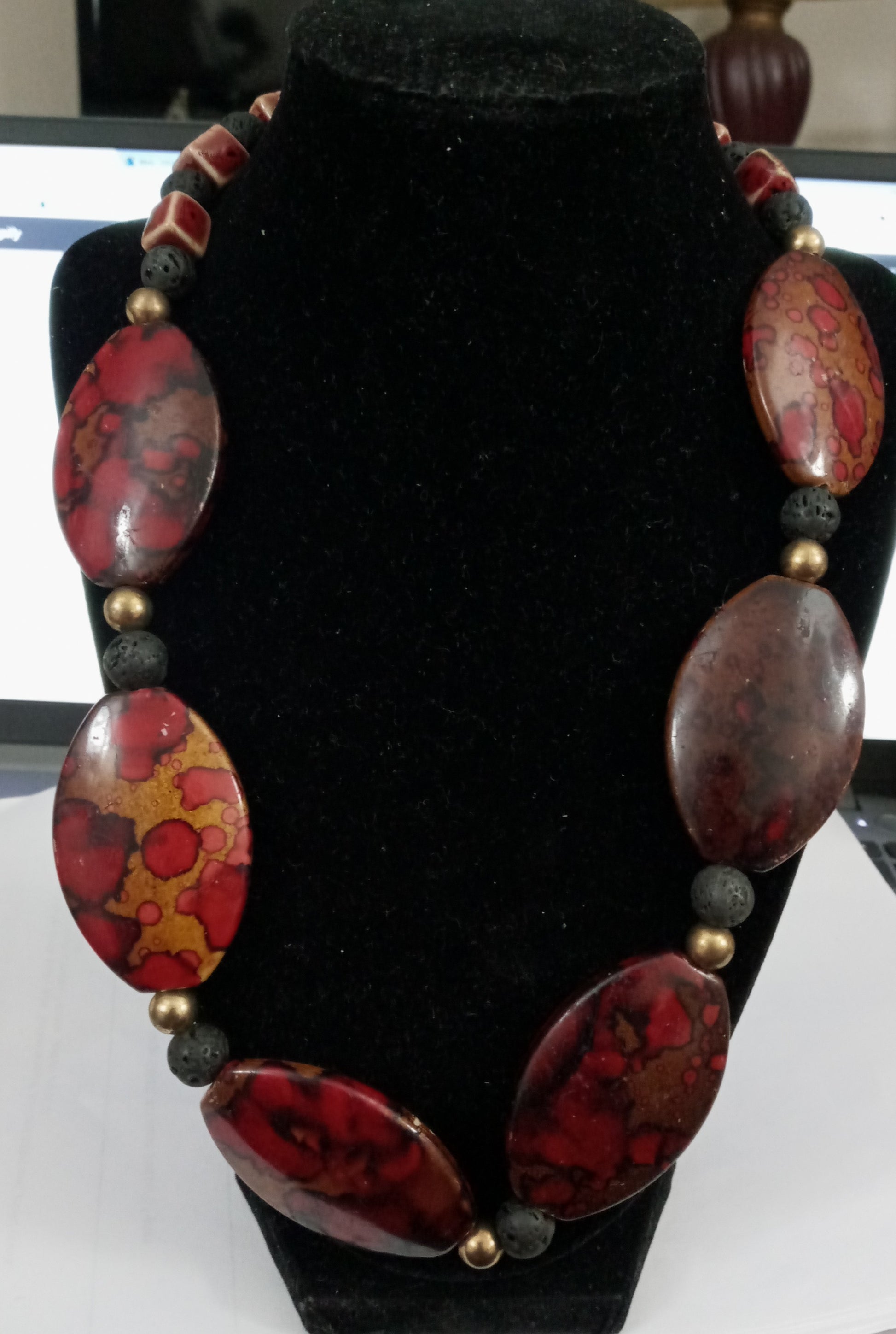 Necklace crafted with large, oval multicolored (maroon red, brown, black) Acrylic beads with abstract imagery, adorned with maroon red small Porcelain square stones, black corrugated beads, gold-colored round beads, with gold rondelles and gold-colored clasps to fasten.