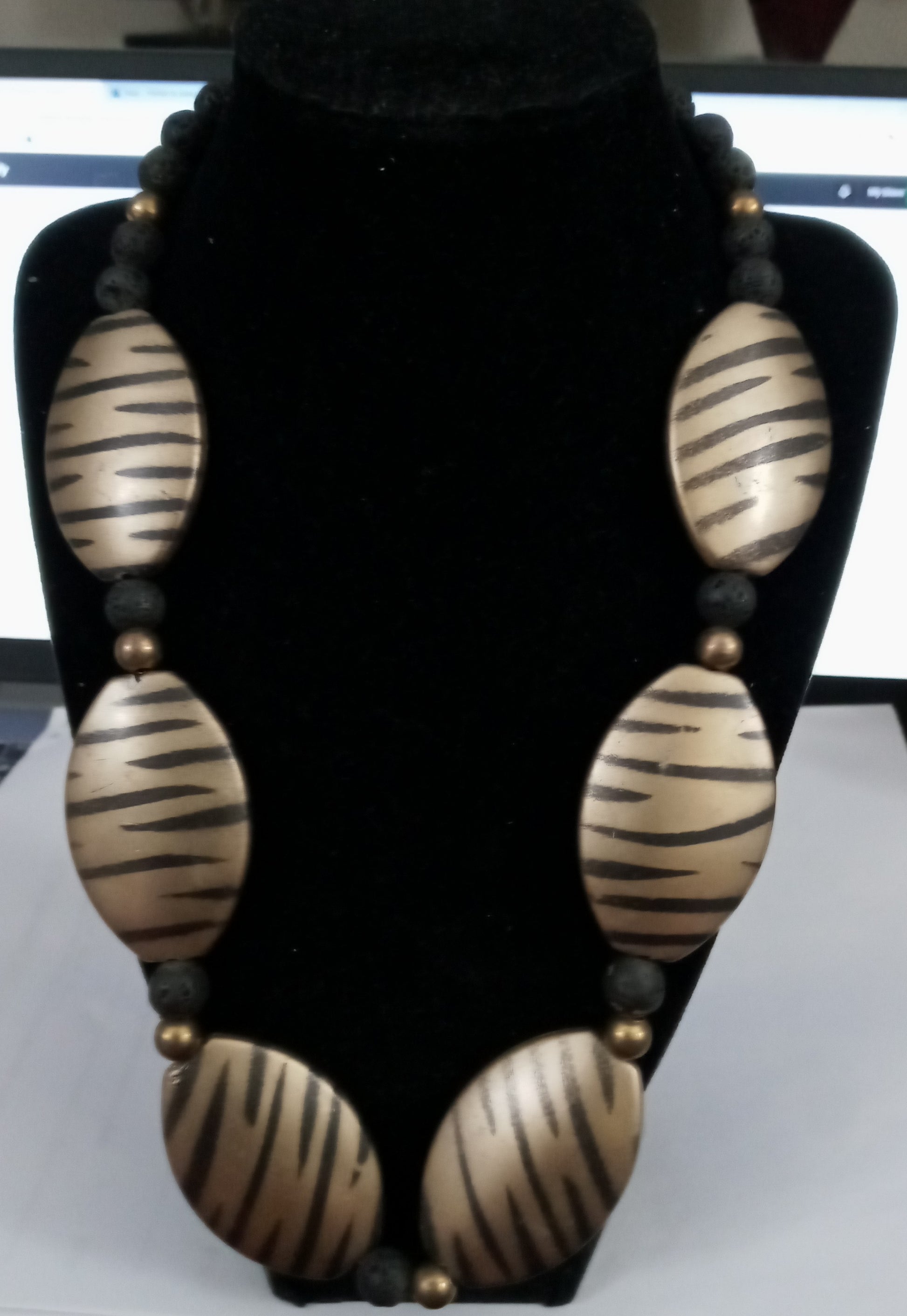 Necklace crafted from large cylindrical gold-colored Acrylic beads with black streaks , adorned with corrugated black beads, gold-colored round beads , tiny gold-colored corrugated beads with gold clasp to fasten.