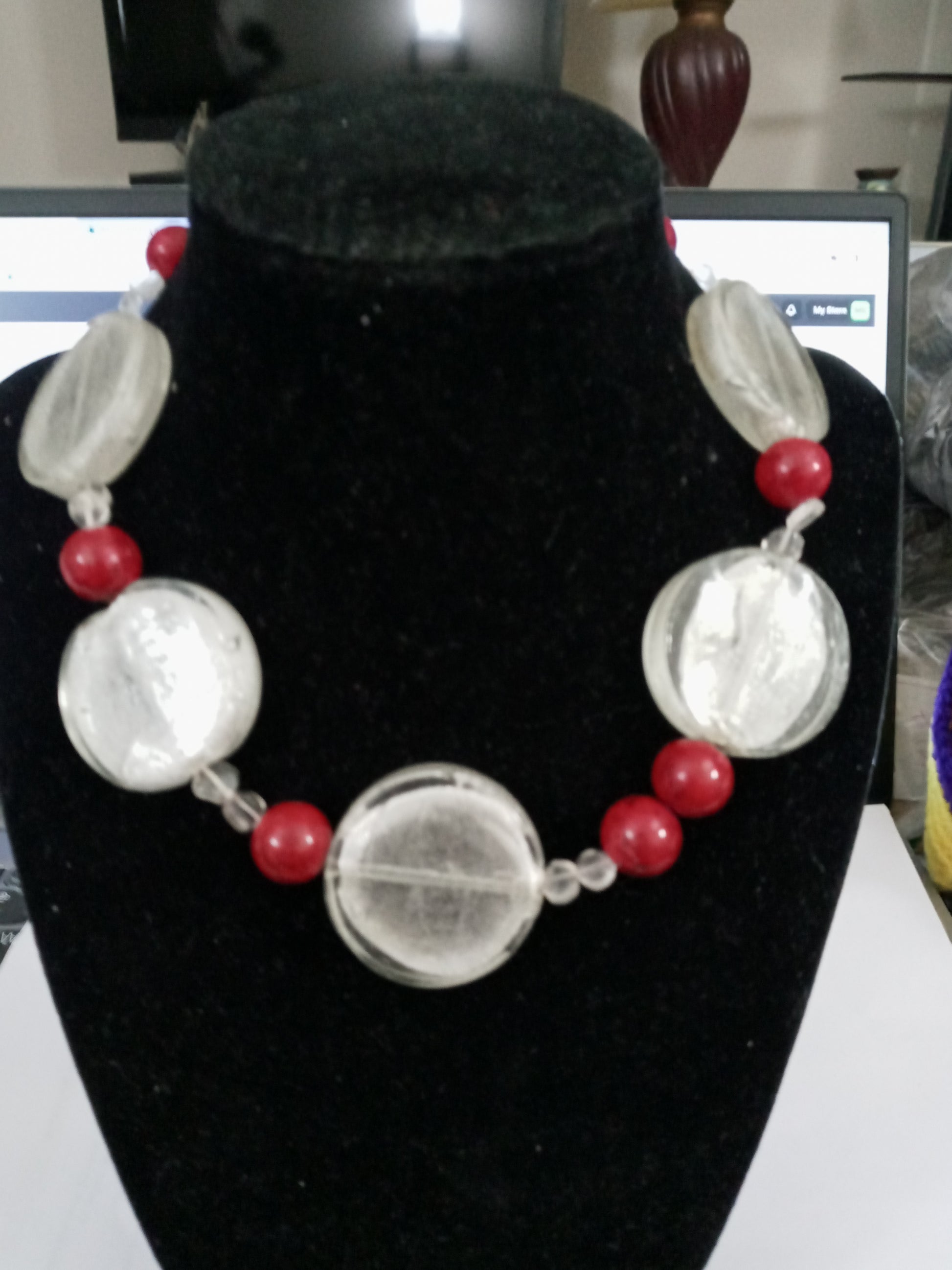 Necklace crafted with five (5) large, white and heavy glass stones adorned with crystals and red round Porcelain stones, tiny silver corrugated rounds with screw-in latch to fasten.