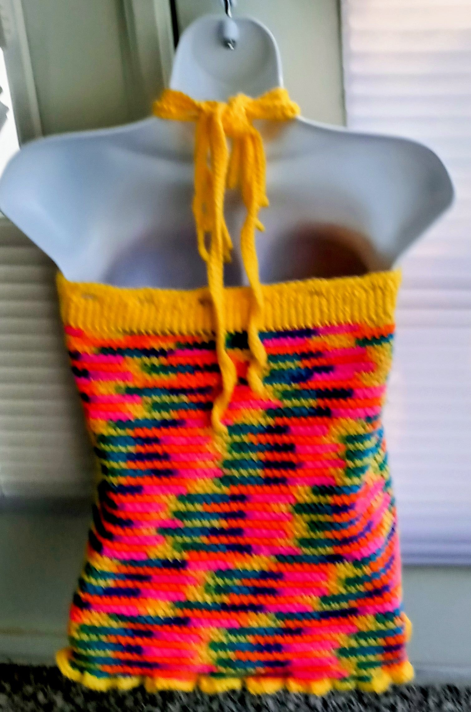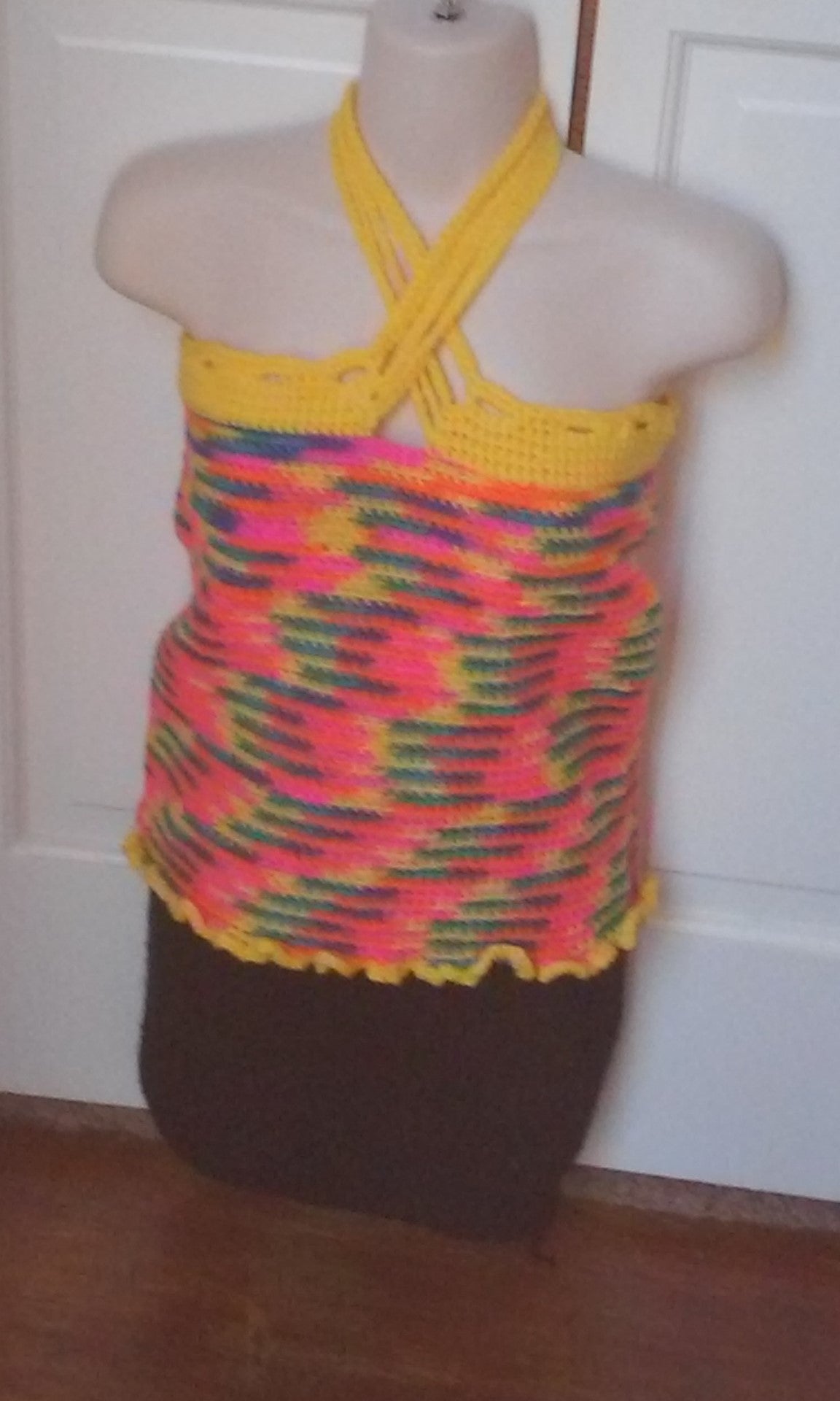 Crocheted (orange, yellow, purple, pink, turquoise) Tank Top with yellow neckline and tie strings with one layer of frill yellow hemline. (Skirt is not for sale)