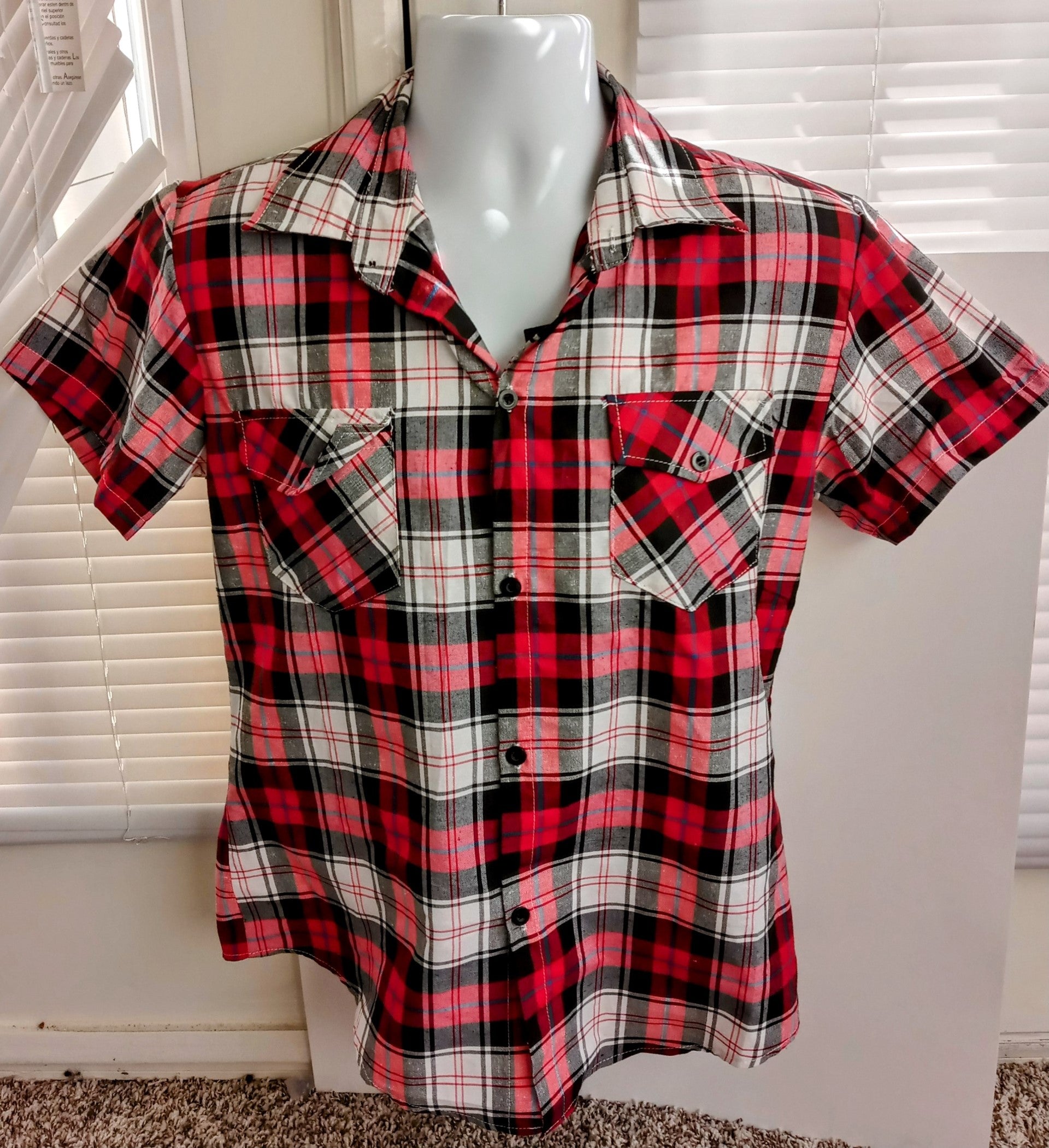 Male Plaid (red, white, black and pink) cotton short sleeved shirt adorned with two pockets with flaps on the chest with black buttons on the pockets and at opening from neckline to hemline.