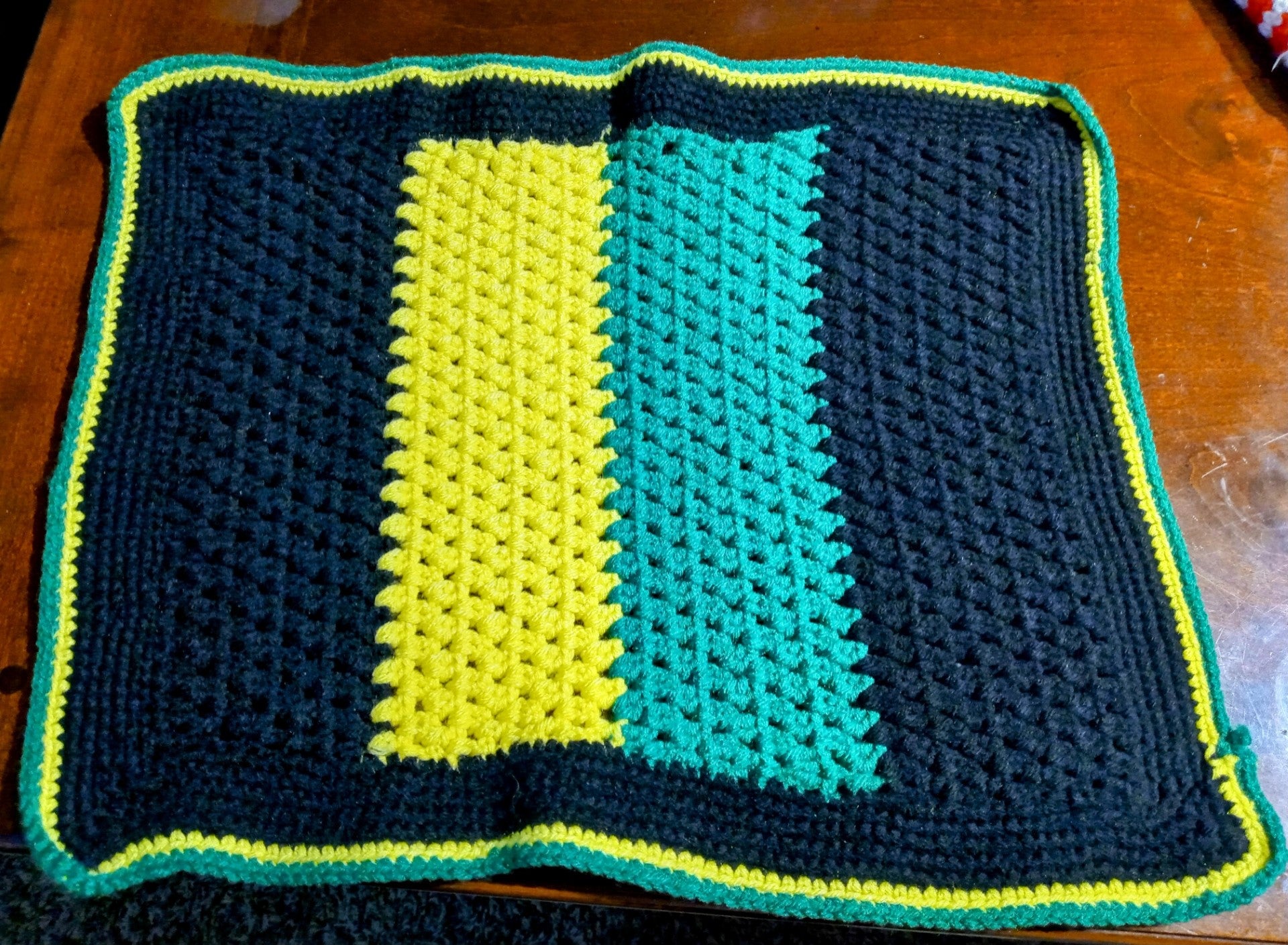 Single black, green and gold crocheted Dining Table Doily to enhance your dining room decor.