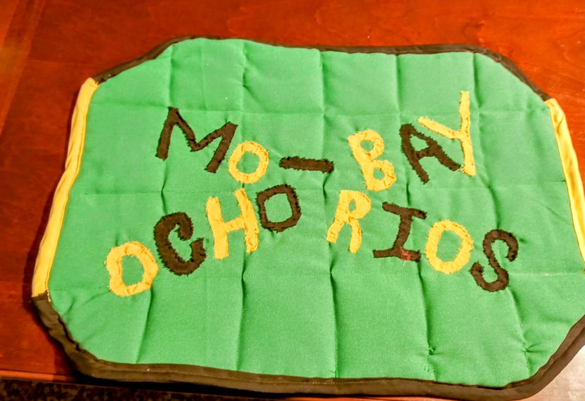 Placemats made with green polyester cotton fabric and edges piped with yellow and black polyester cotton. Adorned with Applique "MO-BAY" "OCHO RTOS" to add to its beauty.