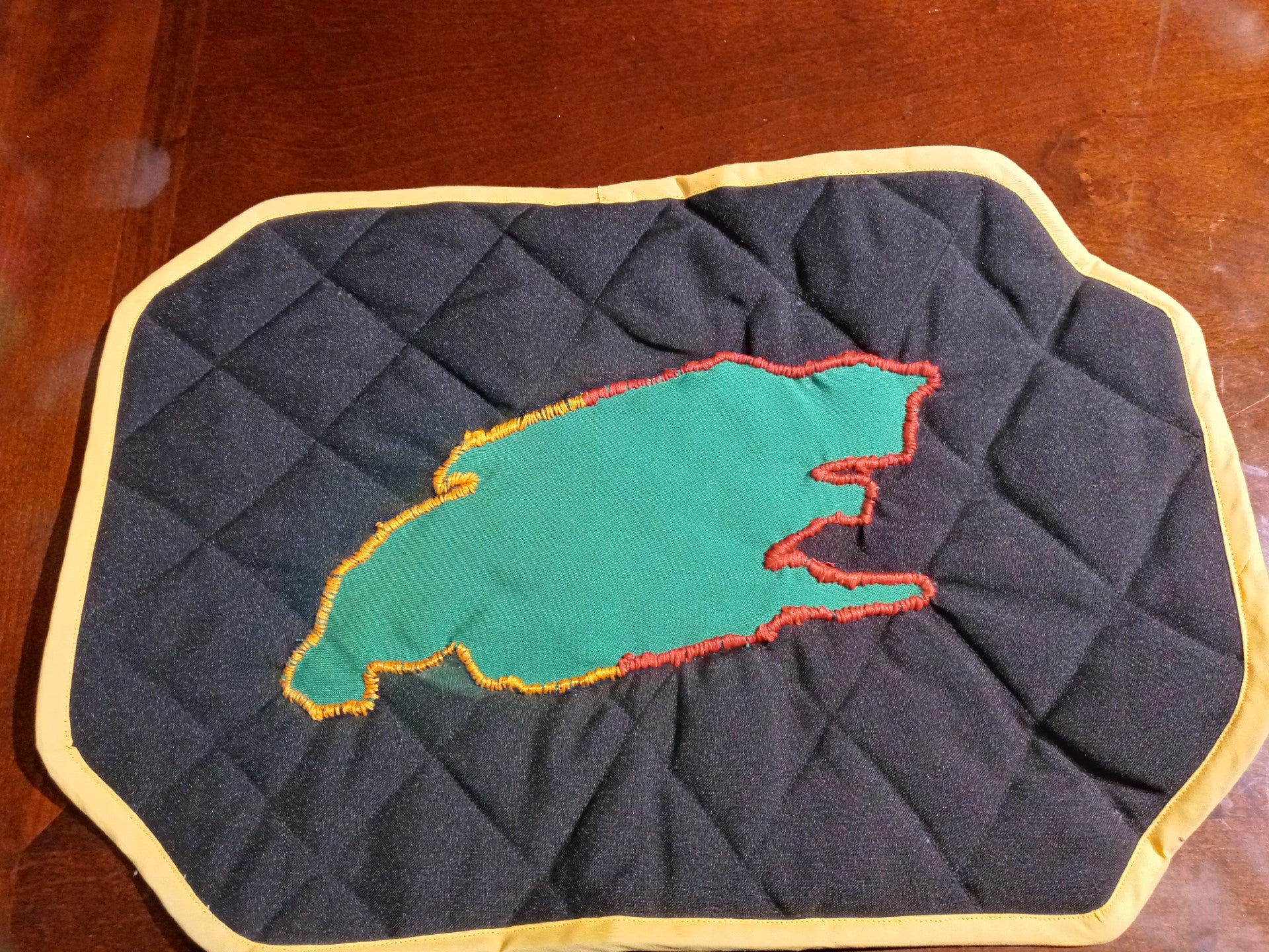 Black fabric Placemat with Applique of the MAP of JAMAICA . Piped with gold to add to its beauty.