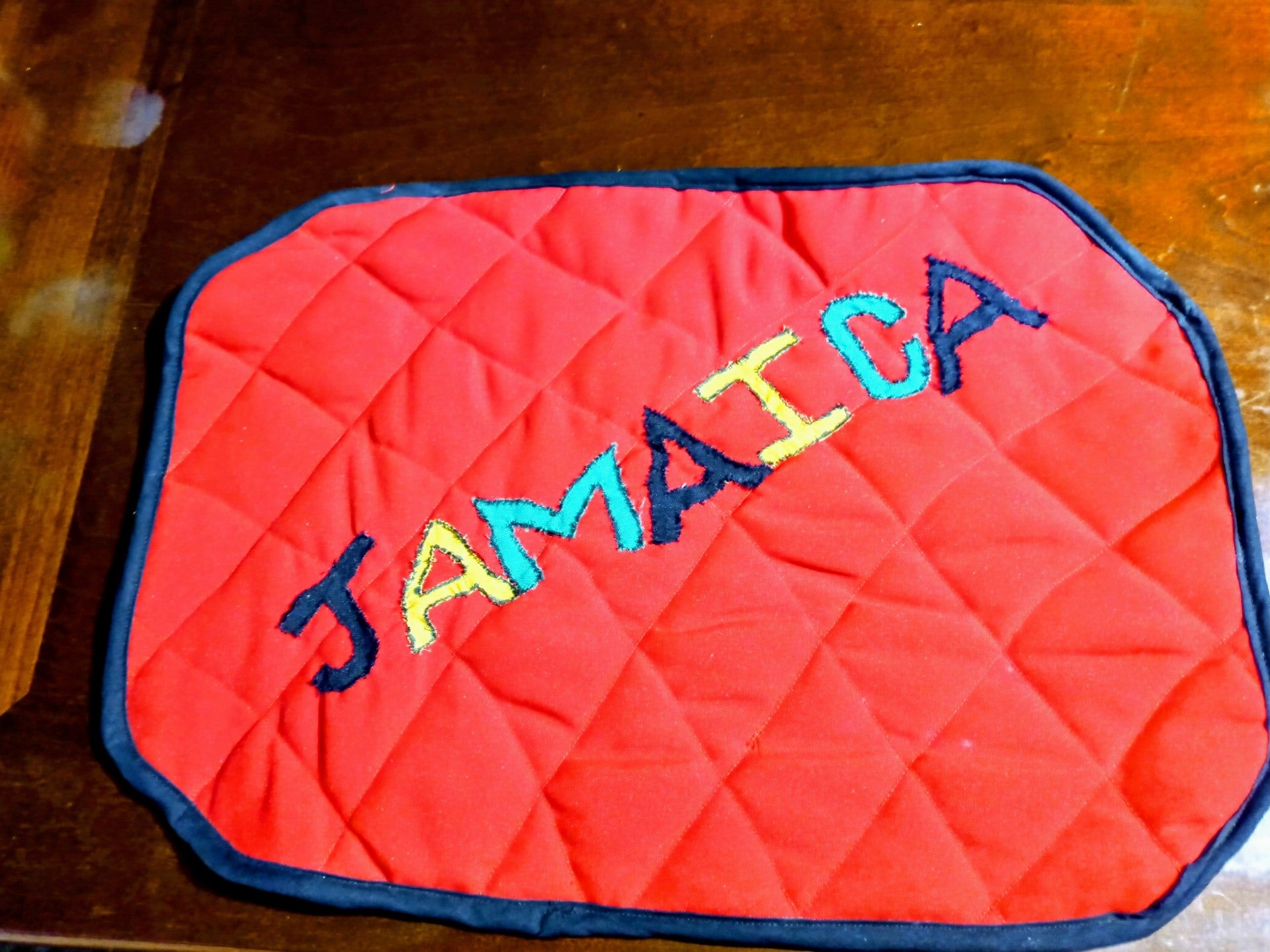 Placemat made with red polyester cotton and piped with black fabric around the edges. Adorned with multicolored Applique with "JAMAICA" to add to its beauty.