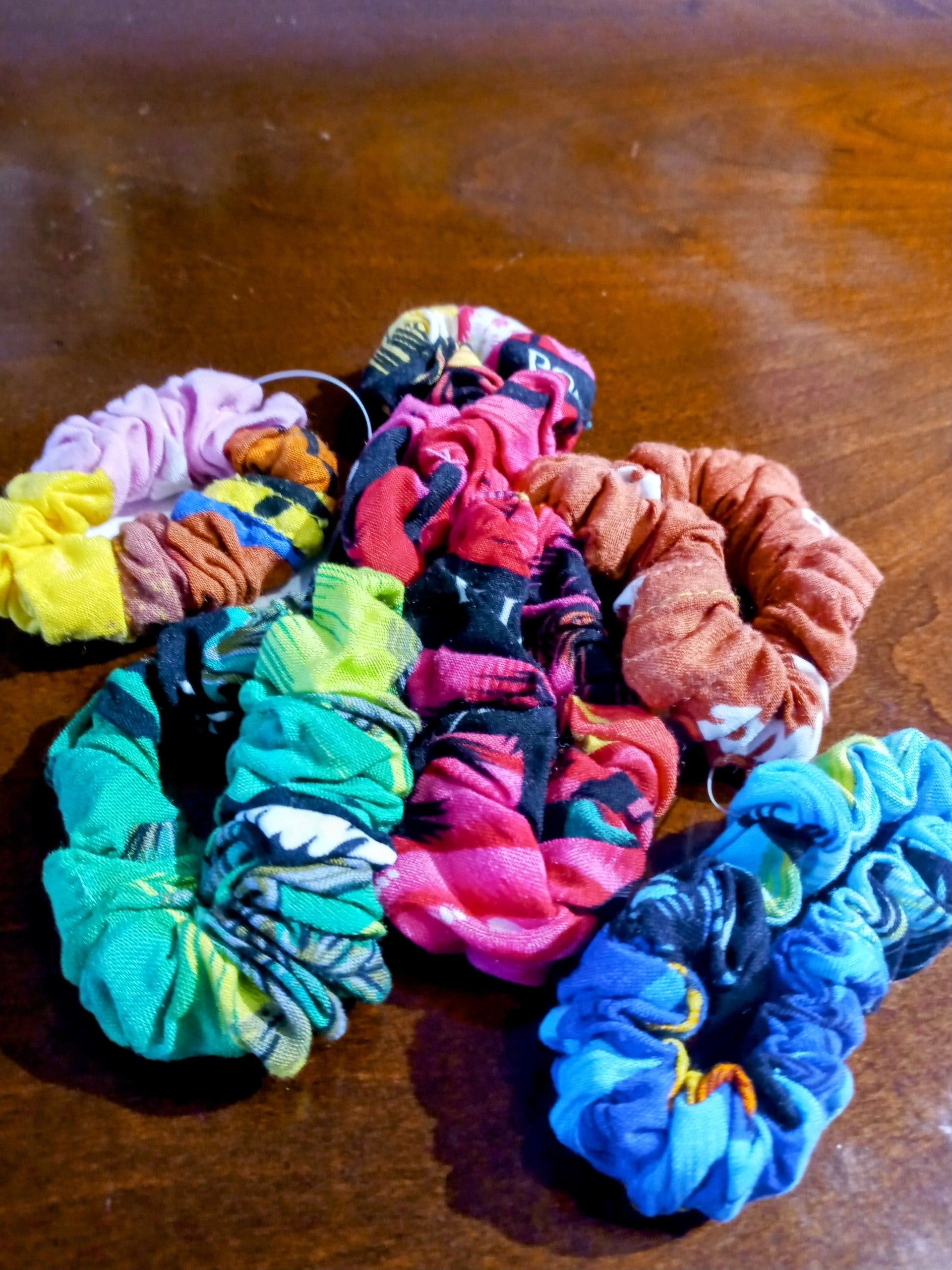Six (6) Multi-colored small Fabric Scrunchies with elastic.