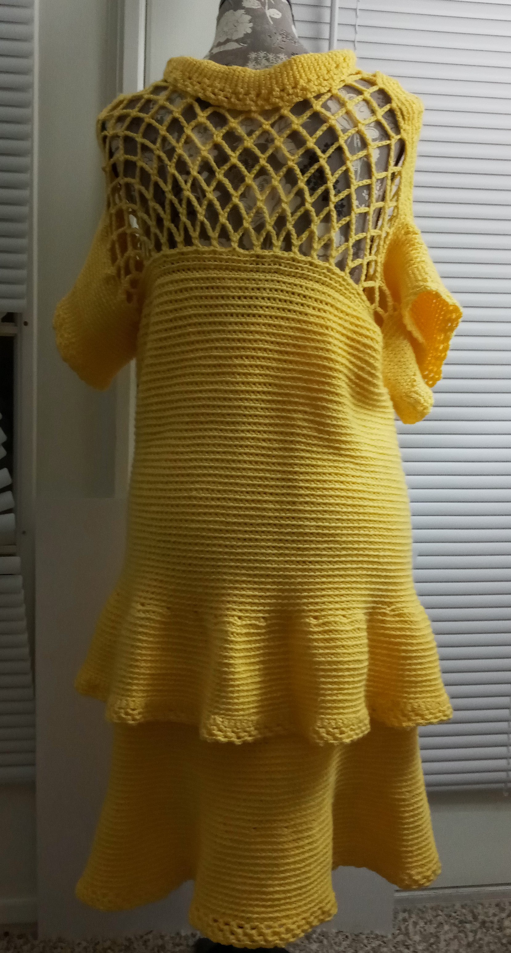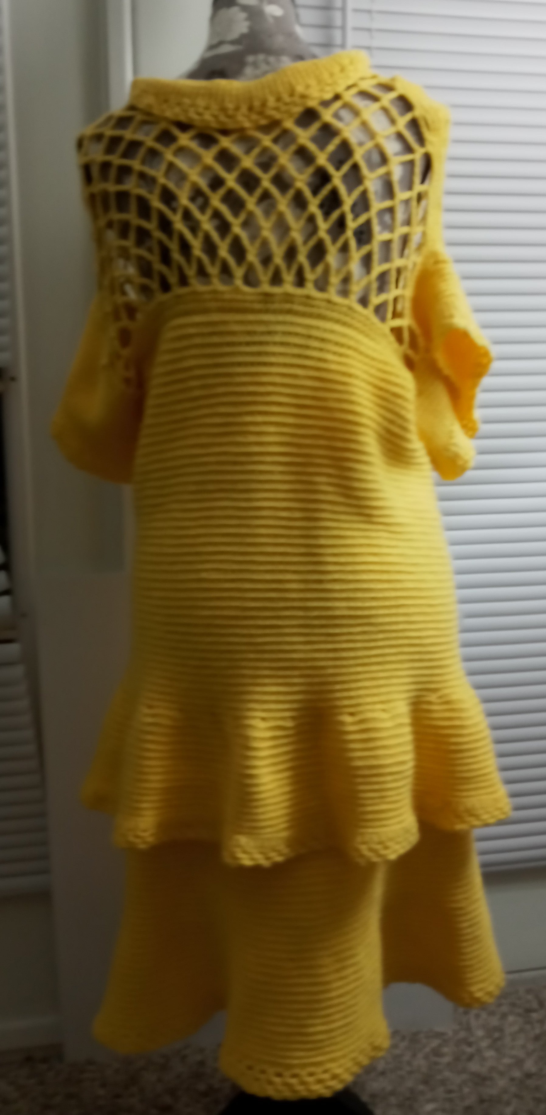 TOP: Yellow mesh top, front and back, from neckline to top of bustline with short sleeves and cut-work from shoulder to end of sleeves, adorned with two rows of chains. Slightly gathered hemline with matching two rows of chain at hemline.