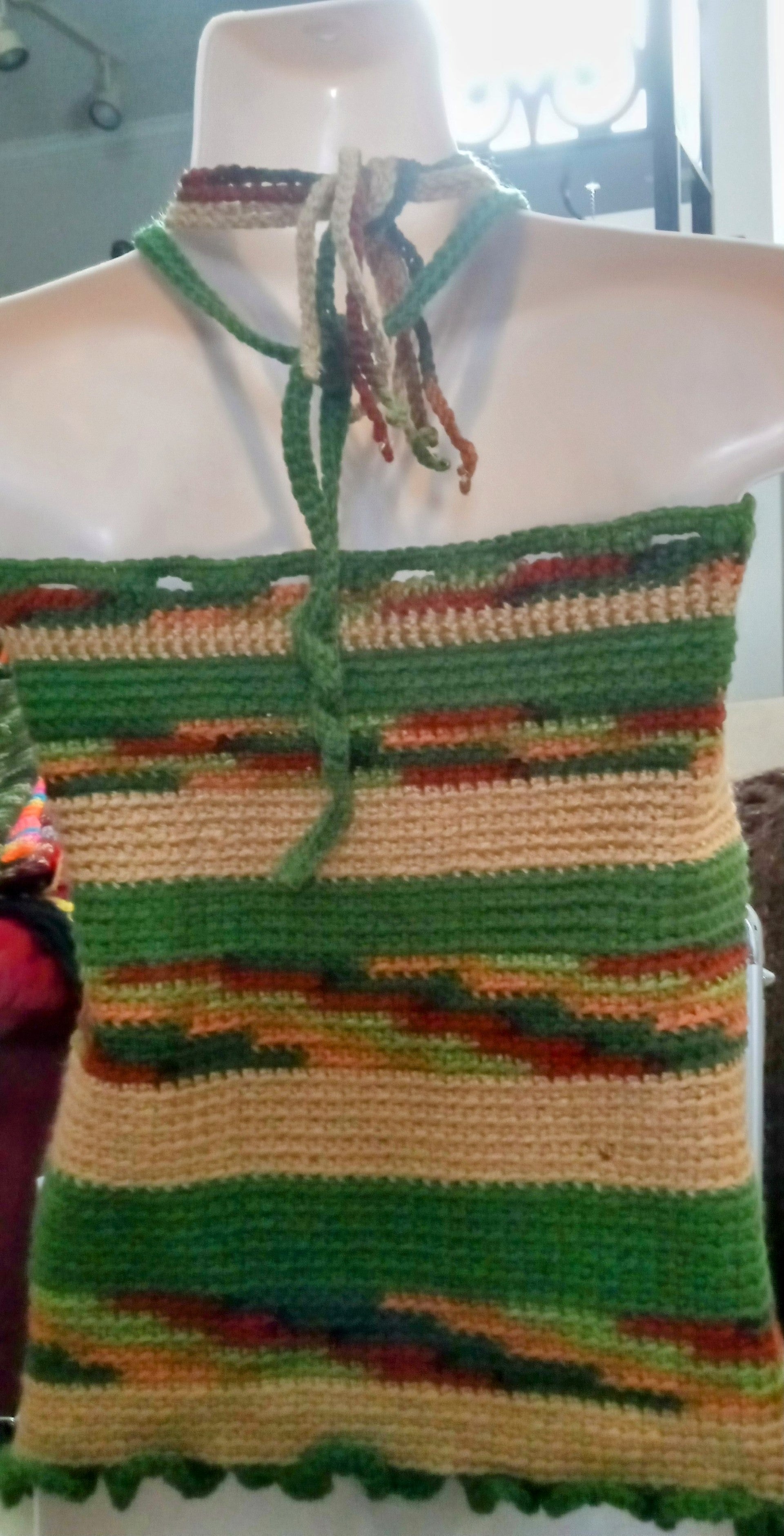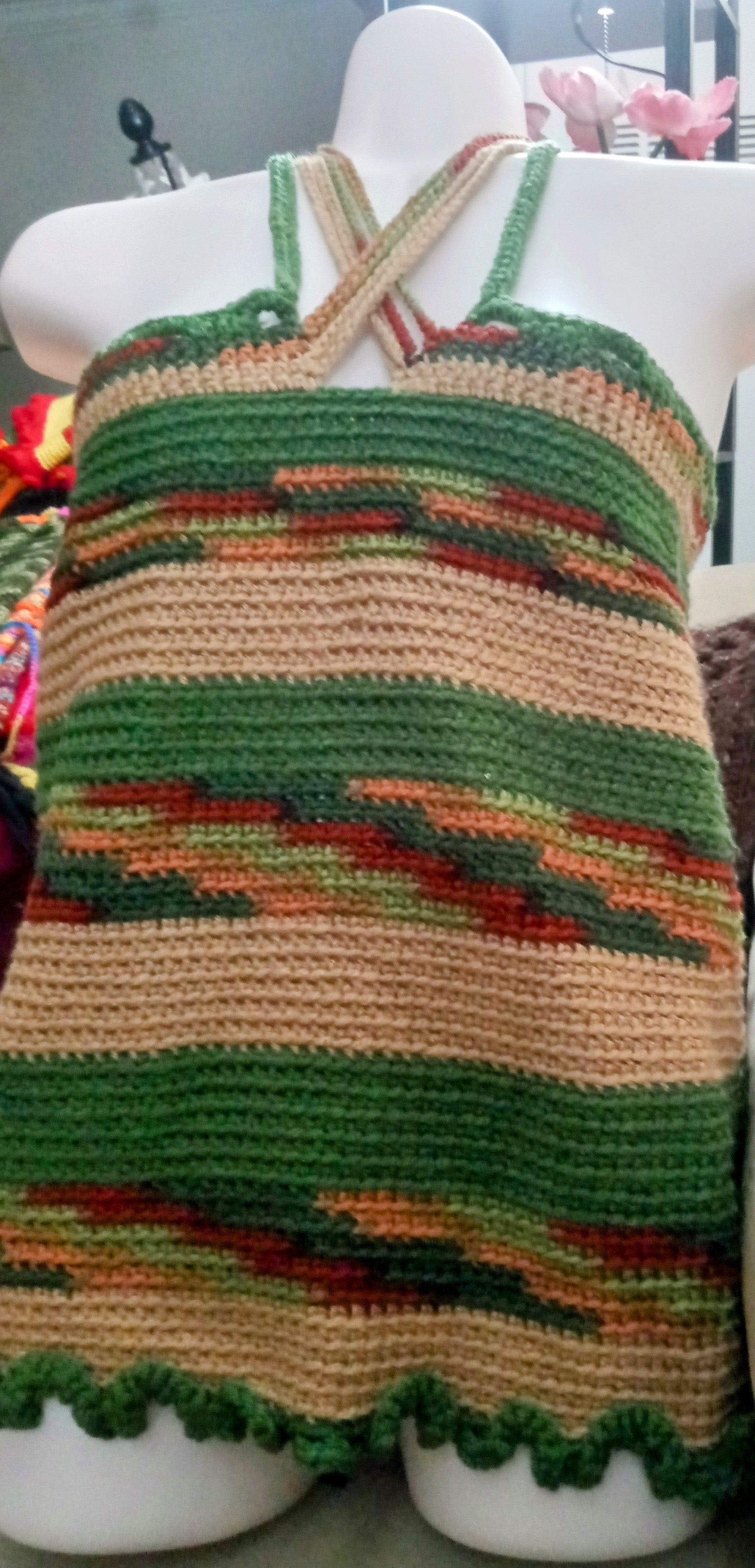 Crocheted multicolored ( green, tan, MC) and plain striped with matching neckline and tie strings with a layer of green frill hemline.