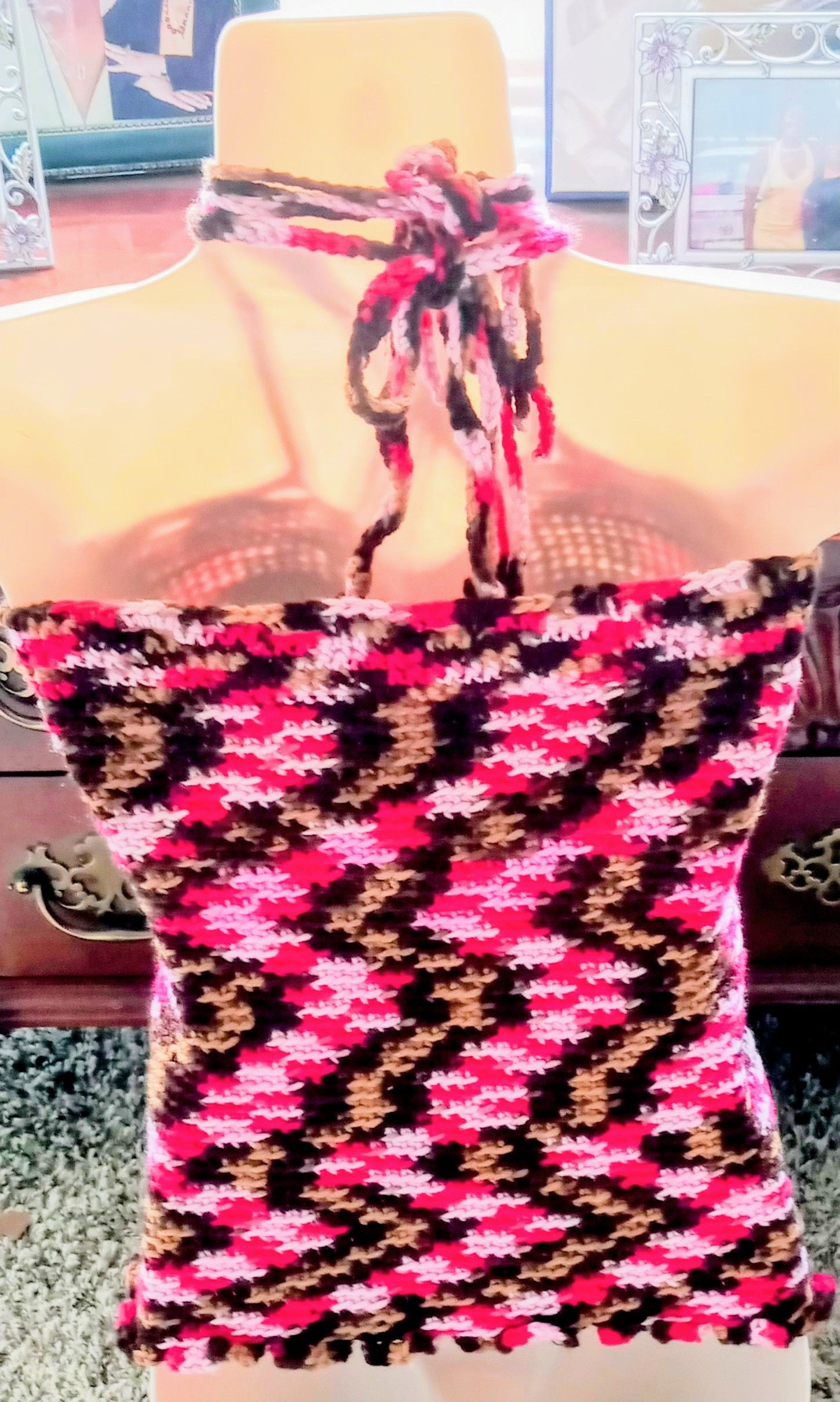Crocheted multicolored (fuchsia, dark brown, light brown, light pink,) Tank Top with matching neckline and tie strings with one layer of frilled hemline.