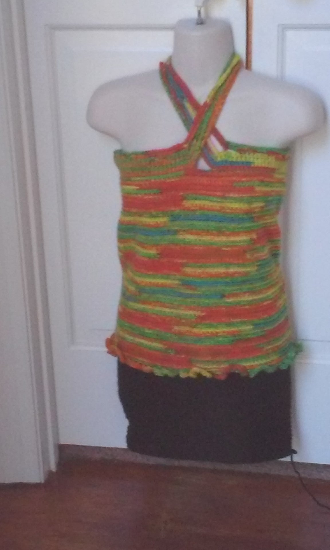 Crocheted multicolored (green, yellow, turquoise, orange) with matching neckline and tie strings. Matching one layer of frilled hemline. (Skirt is not for sale)