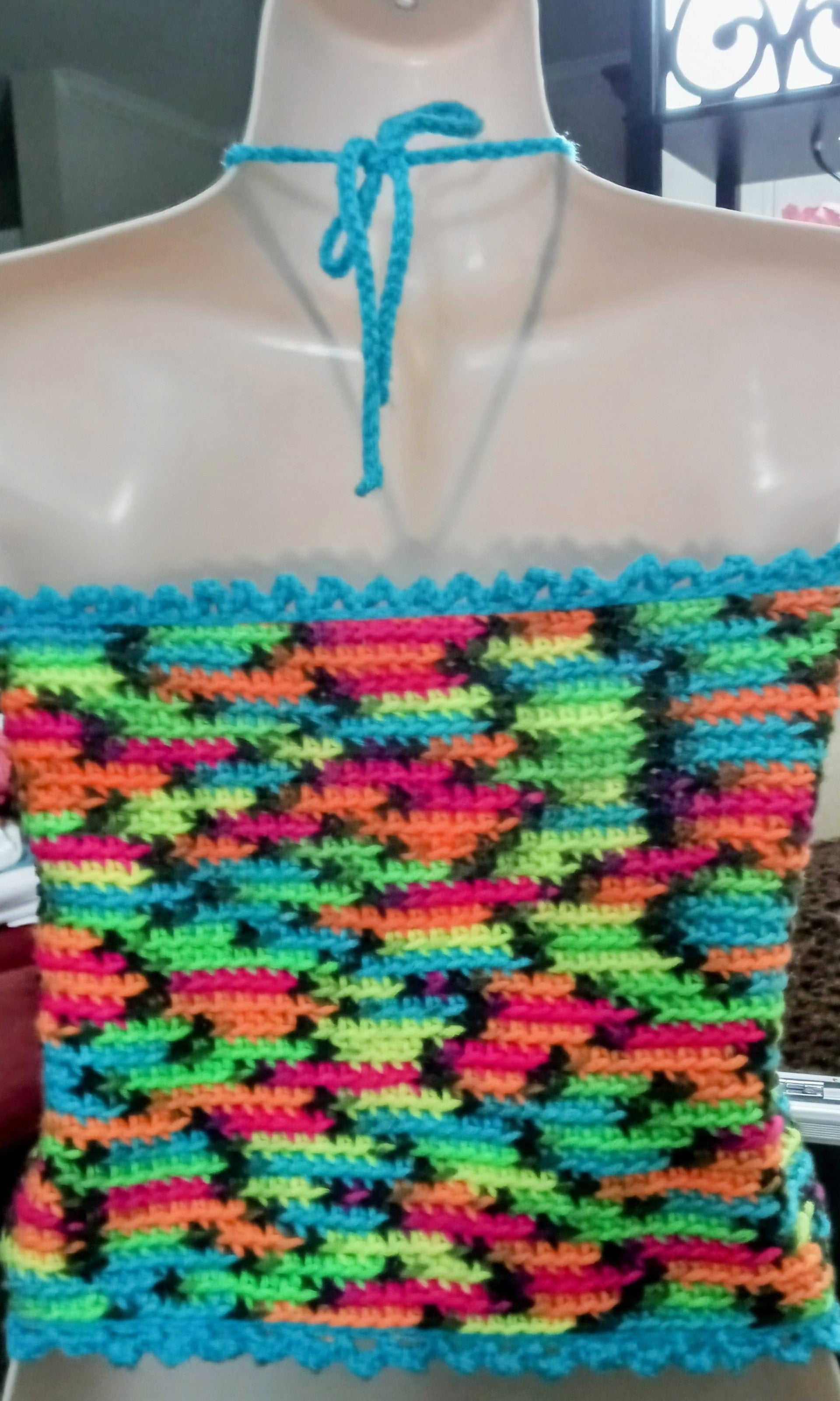 Crocheted multicolored Tube Top (green, turquoise, orange, fuchsia, brown, black) with optional tie string. (Can be tied as a bow to the front)