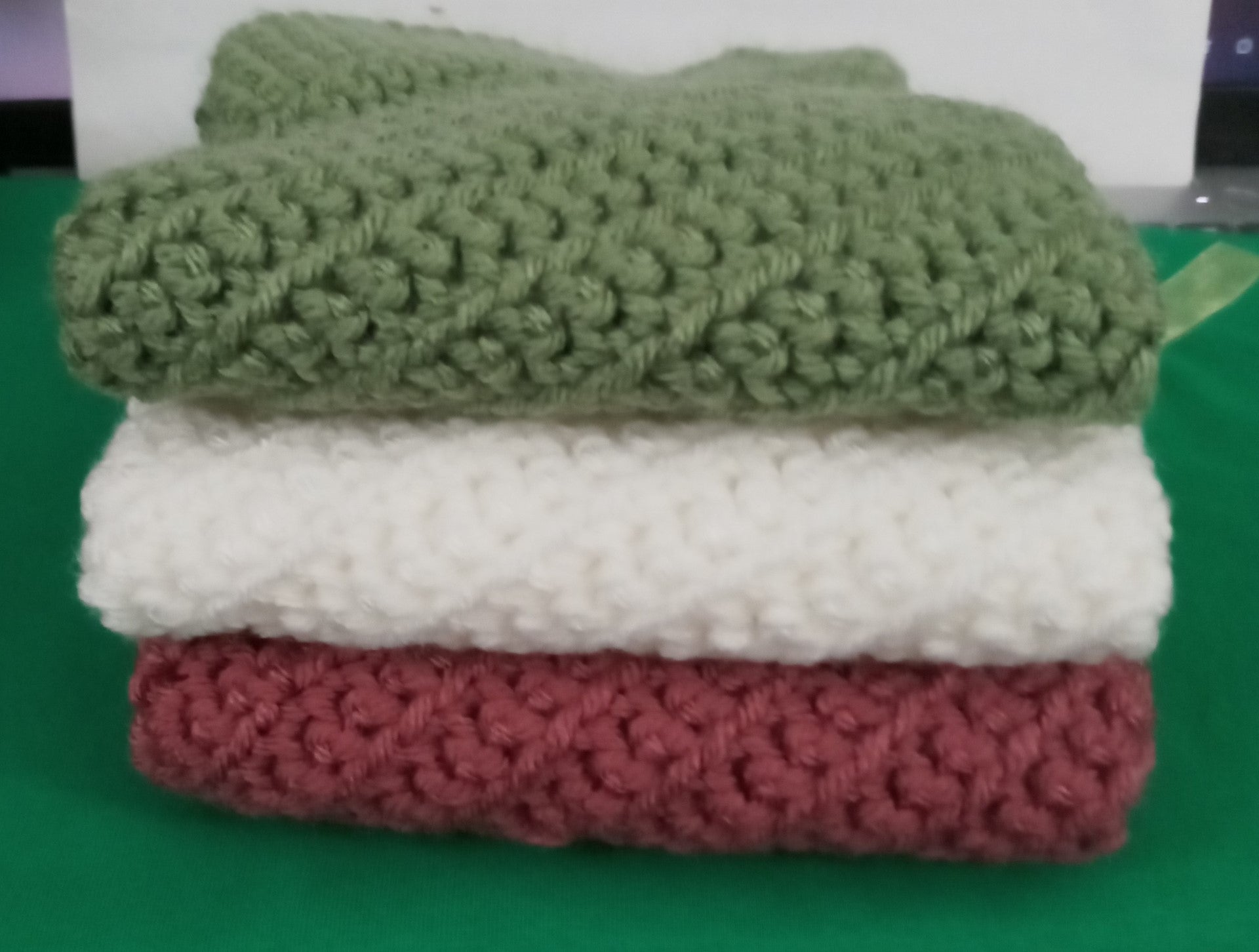 Crocheted wash rags available in several colors in packs of three (3). Excellent to exfoliate , and take regular showers. Get a pack for the whole family. They will love you even more for the gesture.